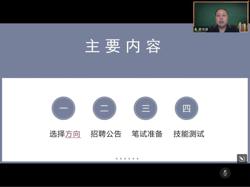 随后,樊书涛从入编考试的招聘公告、笔试、面试如何脱颖而出和试讲冷场如何快速自我补救四个方面讲解“入编要准备什么”,向同学们传授他丰富的经验。在此期间他指出同学们一定要仔细观看招聘公告,了解自己的情况是否满足当地的招聘要求,并酌情考虑是否要进行考编还是继续深造。除此之外,樊书涛还为同学们着重解读了面试综述和试讲,并通过分别播放开封与郑州的两位老师的省优秀课的优质试讲课案例,让同学们明晰了试讲与说课的区别以及试讲课所应有的形式内容,学习了优质课的老师的教态以及教学方法。