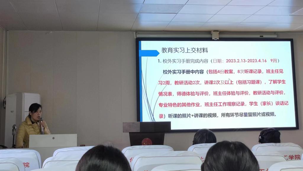 会上,李亚敏向同学们通报了教育实习的具体安排、参与人员、校内实习指导老师、实习单位及实习要求,并详细介绍了教育实习需要完成的任务。她表示,实习过程既是职业认同的过程,也是大家更好地认识教育本质的过程,期待通过细心的引导和纠正,把同学们培养成为一名有教育情怀和良好专业素养的合格的人民教师。她要求,所有同学都要正确认识教育实习,做好实习计划和规划,在实习过程中注重研究,突出创新。