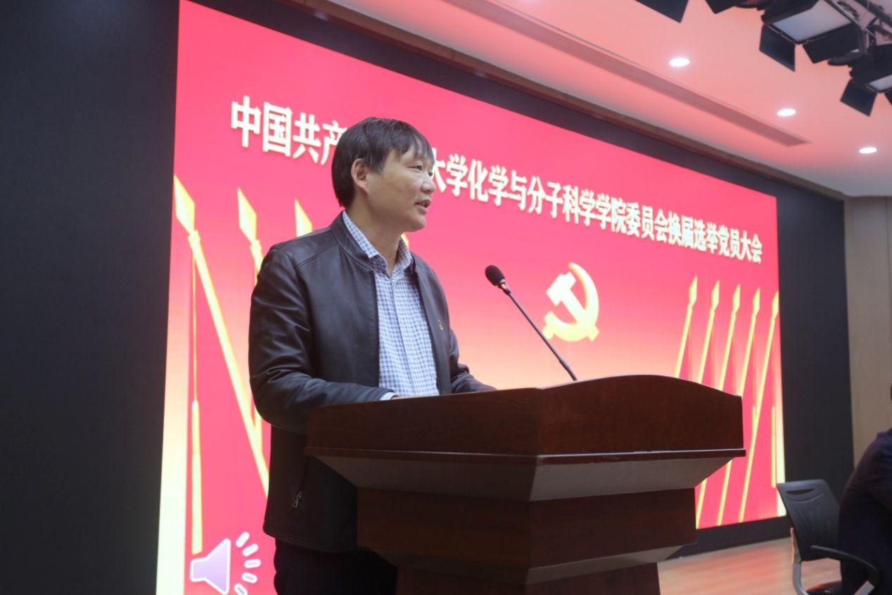 乔梁代表学校党委向大会的召开表示热烈的祝贺,向长期以来为学院、研究院事业发展付出辛勤劳动的全体共产党员、广大教职工生表示崇高的敬意。他首先回顾了化学学科的百年历史,对学院五年来取得的成就给与充分肯定,并对新一届党委提出二点希望:一是要讲团结,学院和研究院一直是一个团结、温馨和谐的集体,大家要心往一处想,劲往一处使,学院党委在发挥引领作用同时,组织好团队,集中力量办大事,培养出大先生、大人才,研究出大成果;二是党员干部要发挥好模范带头作用。共产党员的先锋模范作用是党的先进性的具体体现,只有在社会各个方面都起到先锋模范作用,共产党员才无愧于工人阶级先锋战士的称号。党委委员要能吃苦、顾大局,自觉开展批评与自我批评。新一届党委要充分发挥好党建引领作用,在化学一流学科建设中肩负起历史重任,带领学院、研究院在新时代新征程、新百年新起点上展现新气象新作为。