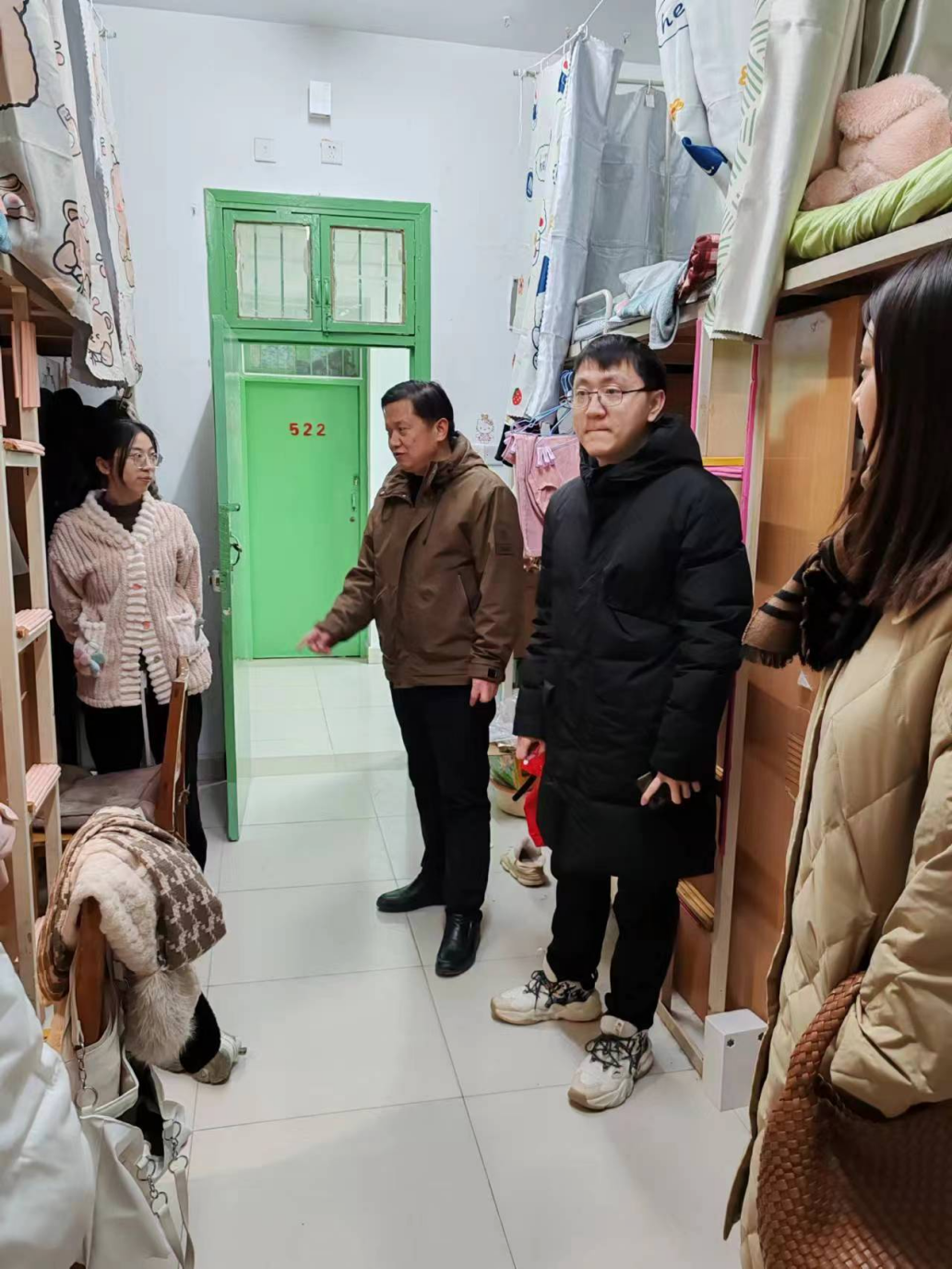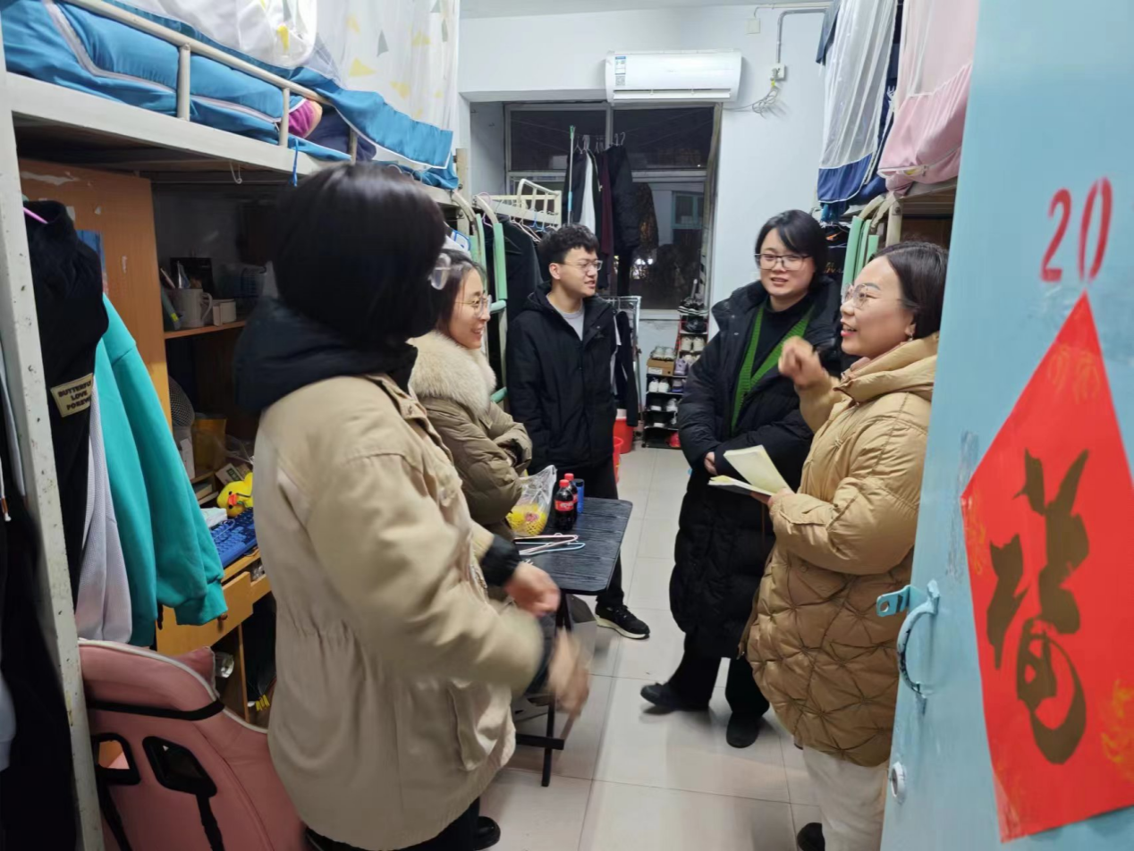 学院党委副书记马文海带领全体学生辅导员,到学生宿舍看望留校学生,对学生进行安全教育并排查安全隐患。针对发现部分学生宿舍私拉电线、充电后忘记关闭电源、宿舍物品堆放杂乱等问题,当场要求学生整改。提醒留校学生注意宿舍用电安全,注意冬季防火,保持宿舍卫生,叮嘱学生注意宿舍防盗防骗,同时注意饮食安全,规律作息,与老师和家长保持联系等。
