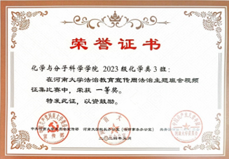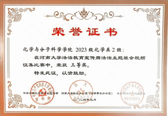 2023级化学类一班、化学类二班分别荣获法治主题班会视频征集比赛一等奖和三等奖、2022级王炳垚同学荣获法治征文比赛二等奖,学院荣获法治教育宣传周活动优秀组织奖。