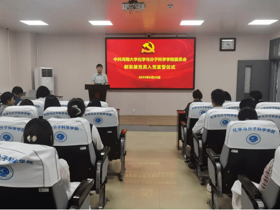 新发展党员代表、2022级化学专业本科生薛凯乐发言。他深情讲述了在党组织的教育培养下取得进步的过程,表示今后一定时刻牢记自己的入党初心,永葆政治本色,为强国建设、民族复兴贡献青春力量!