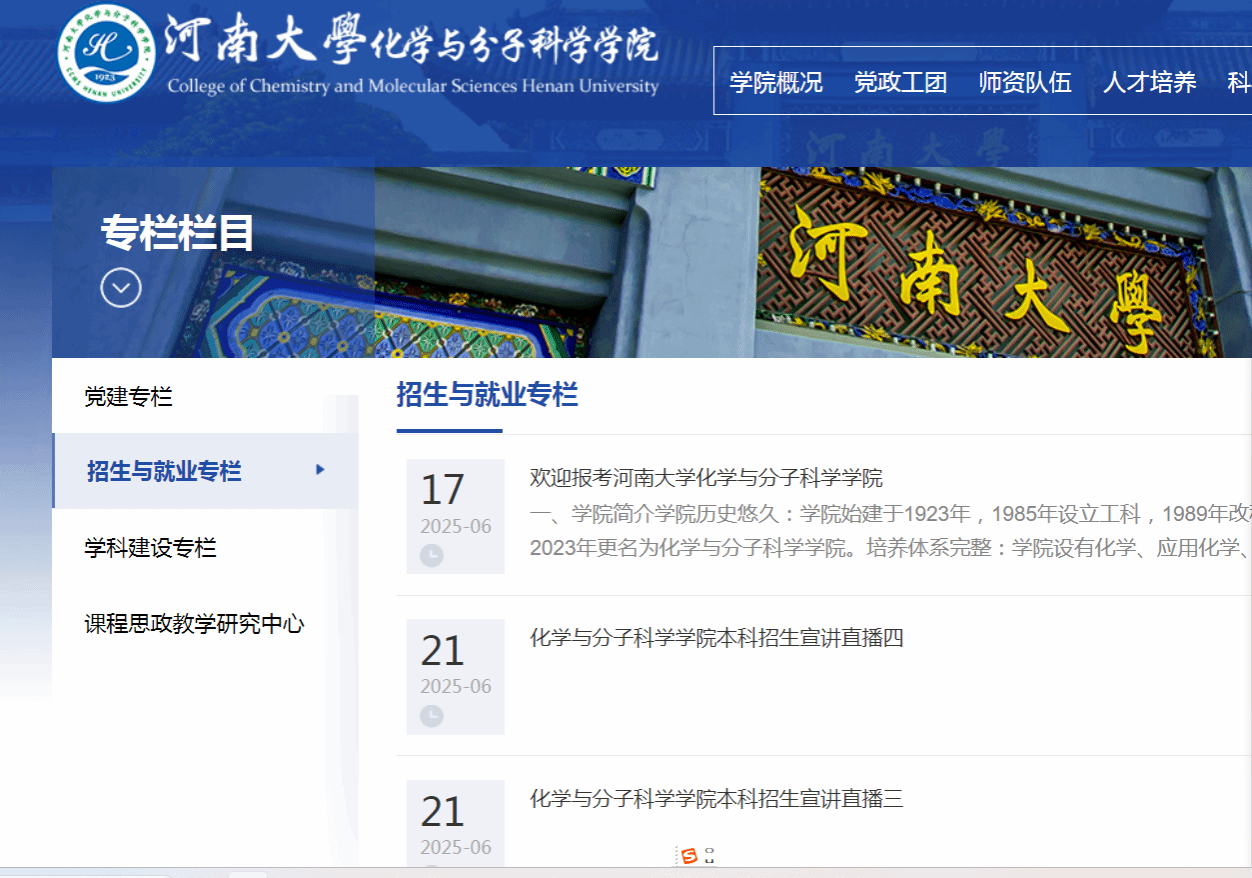 学校公布2025年招生简章和招生计划后,印制学院招生宣传册,及时对学院官方网站招生宣传专栏中的招生简章、招生计划、专业解读、咨询电话等内容进行更新,学院微信公众号同步推出,尤其是对我校化学专业2025年新增“林伯襄实验班”进行重点宣传。执行院长徐元清参加学校招办组织的院长说专业线上直播,胡卫平教授、付记亚教授、李亚敏教授作为宣讲专家参加了学校招生线上直播。2023级本科生王舒心录制了《学姐说专业》招生宣传视频。录制视频在学院网站常年播出。
