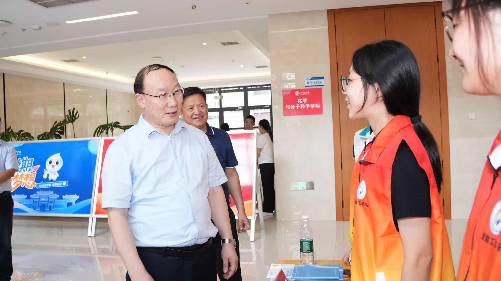 新生报到现场,亲切慰问了辛勤工作的志愿者们,与新生和家长进行面对面交流。他们详细了解了新生们初入校园的感受,认真听取了新生对未来的规划与期待,并鼓励新生们珍惜宝贵的大学时光,积极投身于学术研究和文化活动中,努力成为德智体美劳全面发展的新时代青年。