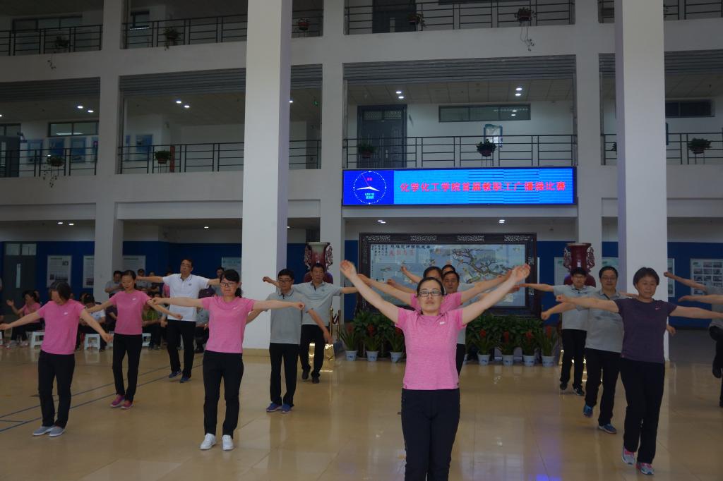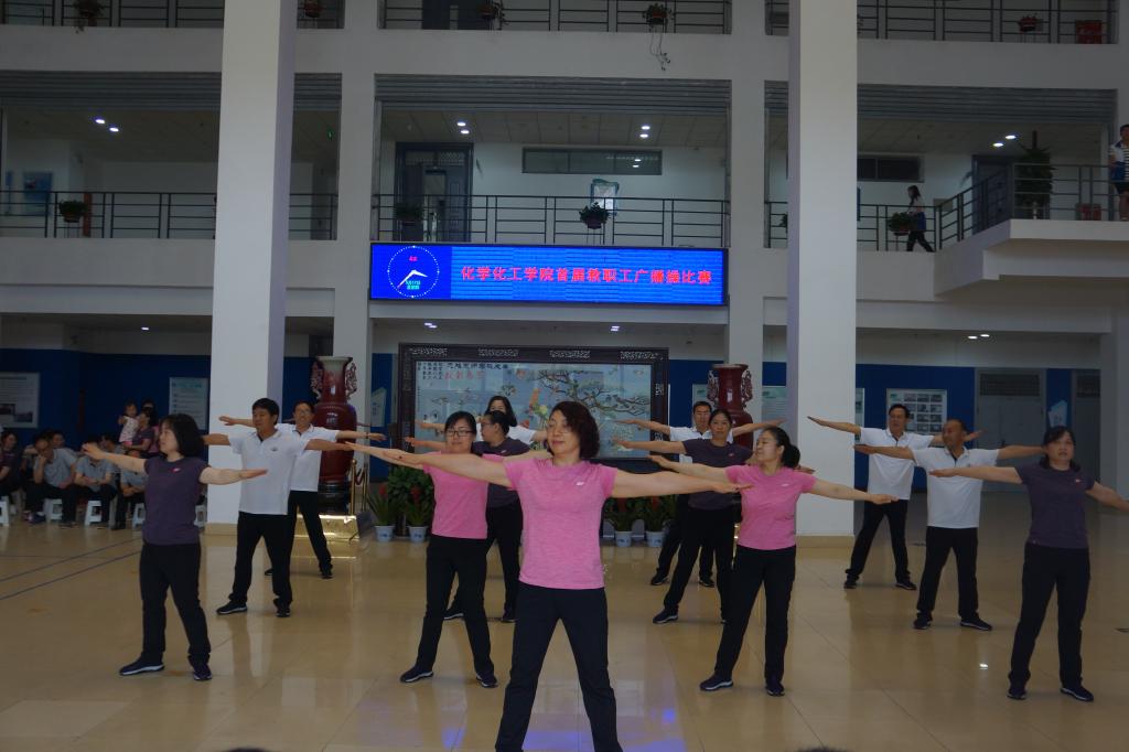为进一步增强教职工体质,丰富教职工文化体育生活,5月17日下午,化学化工学院举办首届教职工广播体操比赛。校工会主席沈洁霞、副主席罗莉、焦峰、宋菊芳等工会领导应邀参加。比赛由国际教育学院副书记、工会主席李从国,数学与统计学院副书记、工会主席王中国及体育学院四名学生担任评委,化学化工学院教师陈欣主持,学院全体教职工参加。