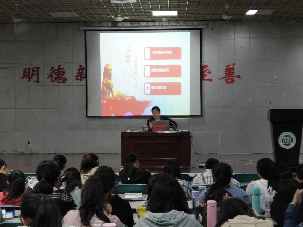 马文海为在座同学讲解党员的发展程序,他首先结合过去的工作经验,用幽默的语言教导同学们要在生活中更好地与他人交流。接着他从“入党积极分子的确定”、“发展为预备党员”、“转为正式党员”三个方面详细介绍了成为党员的各个步骤,为同学们解答了党员培养中出现的问题。同时,在报告会中,马文海指出同学们要端正思想态度,杜绝弄虚作假行为,以“全心全意为人民服务”为宗旨,不断深化自我,提高思想觉悟。