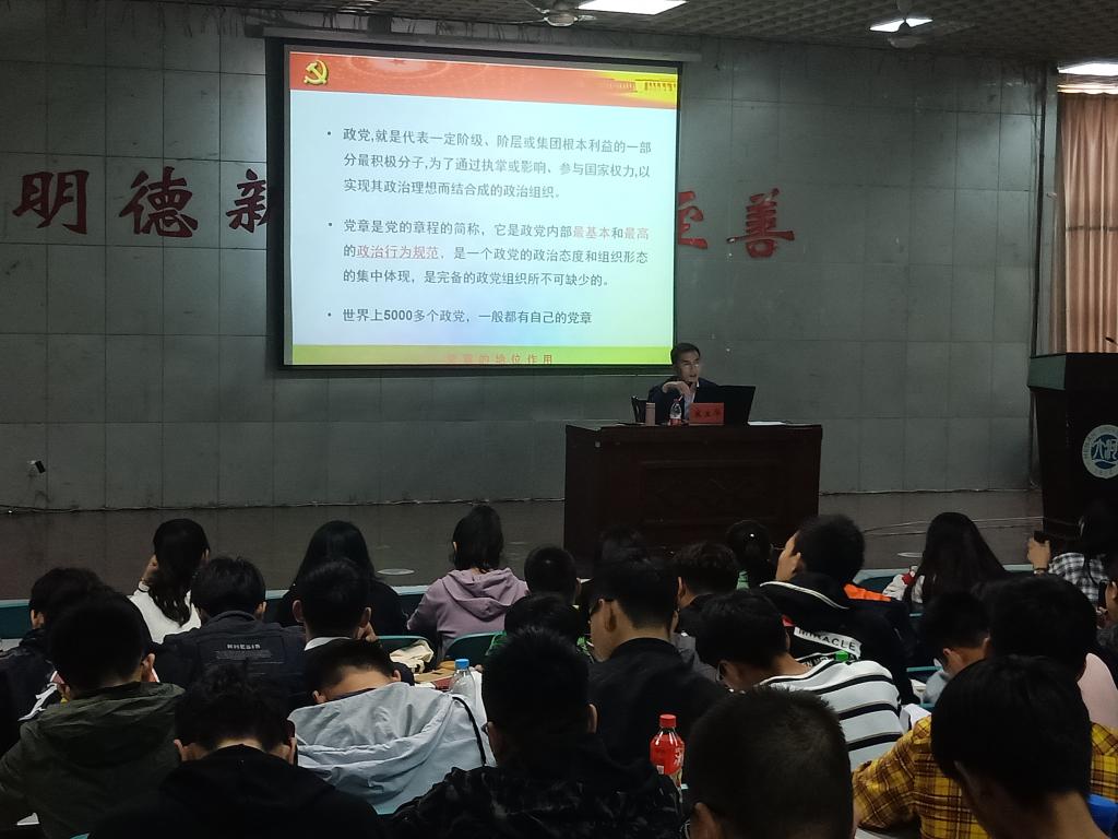 宋立华以“学习党章,坚定信念”为主题对党章的地位作用、历史沿革、内容结构等展开了论述。他提到党的章程是政党内部最基本和最高的政治行动规范,是一个政党的政治态度和组织形态的集中体现,是完备的政党组织不可缺少的。党章是全党必须遵循的总章程,也是总规矩。同时他希望在座同学可以认真学习党的章程并恪守不渝。
