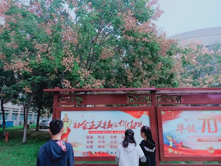 新更换的红色院牌,因整个底漆经过彻底清理和重新粉刷,而显得更加鲜亮整洁,使素雅的大楼生动了不少。同时,在学院两侧醒目的位置,安装了新的宣传栏,每位经过的师生都能第一时间看到宣传栏的新内容。“庆祝中华人民共和国成立70周年”、“新时代,新思想”、“社会主义核心价值观”......每一次的驻足观看,都是一次爱国主义教育;每一次的轻声诵读,都是“文明校园、和谐校园、美丽校园”的一次更深的感受。学院门前,一盆盆菊花在习习秋风下摇曳着身姿,争奇斗艳,互相映衬。“黄花遍国中,汴菊最为名”,在这芬芳四溢的菊花名城里,足不出院,也能欣赏到菊花的风韵。科研学习之余赏菊,不禁令人心旷神怡!