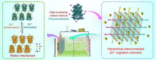 近日,化学化工学院,河南省多酸化学重点实验室的赵俊伟教授课题组开展的多金属氧簇在水系锌离子电池领域的研究工作“First high-nuclearity mixed-valence polyoxometalate with hierarchical interconnected Zn2+ migration channels as an advanced cathode material in aqueous zinc-ion battery”在国际能源领域顶级期刊Nano Energy[74 (2020) 104851]上发表(影响因子15.548)。