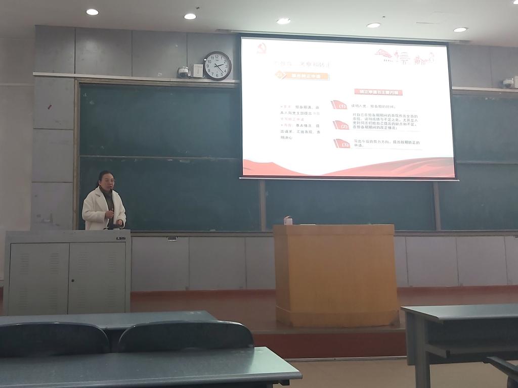 宁攀首先简要介绍了成为党员的基本要求以及发展党员的工作流程。接着,宁攀进入正题,讲解了中国共产党员的发展流程,包括申请入党、入党积极分子的确定和培养教育、发展对象的确定和考察、预备党员的接收以及预备党员的教育、考察和转正五个程序。讲解过程中,宁攀详细介绍了从入党积极分子到成为正式党员过程中的相关要求,也让同学们了解到入党流程中出现的相关问题。宁攀一再强调作为入党积极分子一定要端正入党动机,希望入党积极分子们能够认真学习党课,争取早日成为一名正式党员。