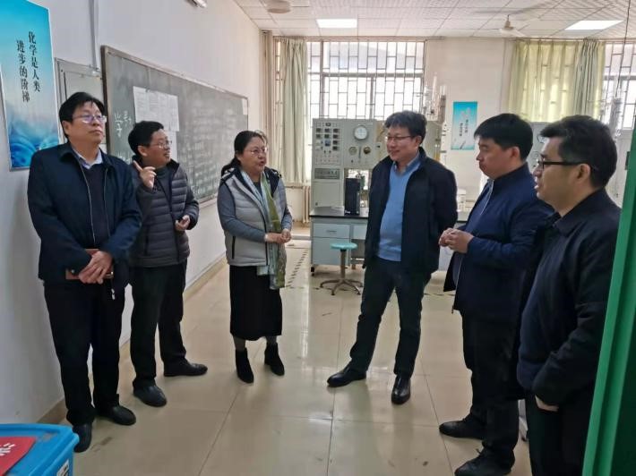 阚云超一行先后调研了实验教学中心化工实验室、物理化学实验室、化学品仓库。化学化工学院党委书记翟新礼、院长柏䶮、副院长刘学军从课程开设、仪器使用、药品安全以及科普工作的开展等方面分别进行了详细汇报。阚云超对化学实验教学中心的安全、卫生、试剂等开课准备工作给予了充分的肯定,他指出,实验教学工作是本科教学的重要组成部分,要求实验中心在切实保障安全的前期下,适当增加综合实验的开设比例,提高大学生的实验操作技能和动手能力,满足新时代本科教学的要求。另外,要充分利用好依托实验中心建设的河南省科普基地,为提高大众科学文化素养做出贡献。