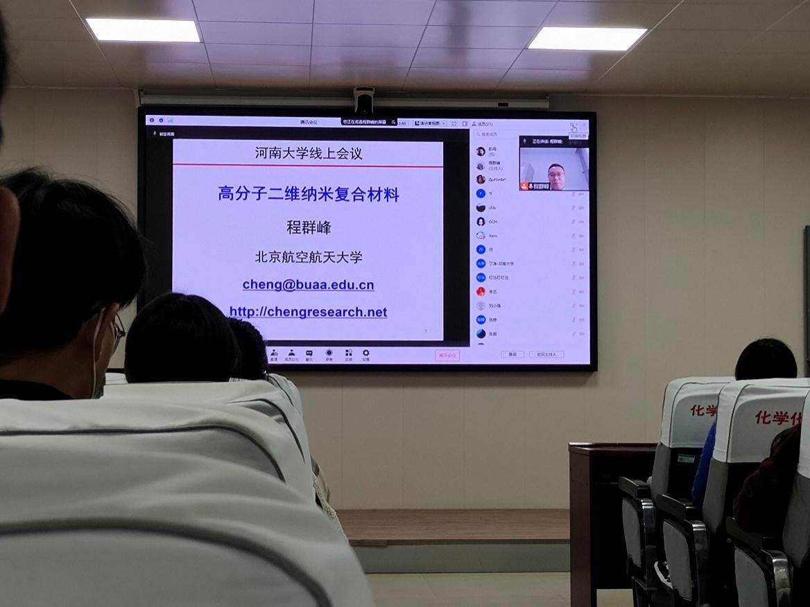 1117日上午,应化学化工学院邀请, 学院1999级校友、国家杰出青年基金获得者、北京航空航天大学化学学院副院长程群峰教授做了一场题为“高分子二维纳米复合材料”的网络报告。化学化工学院教师和研究生近百人在226会议室聆听了报告。会议由副院长徐元清主持。