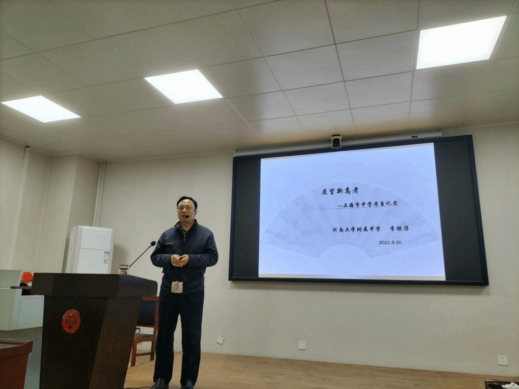 会议上,李银涛老师以展望新高考——上海市中学考察记实为题,从现有高考制度社会所反映出的问题出发,引发同学们思考,说明了实施新高考的必要性。首先,他提出新高考的基本原则和主要措施,介绍了实施新高考的启动时间,批次和地区,其中我省属于第三批次,实际启动时间为2021年。同时,通过几个思考问题,详细的分析了浙江,上海以及江苏新高考模式的优势和弊端,比如说:“选考”的不同,等级赋分,录取依据所占百分比等。