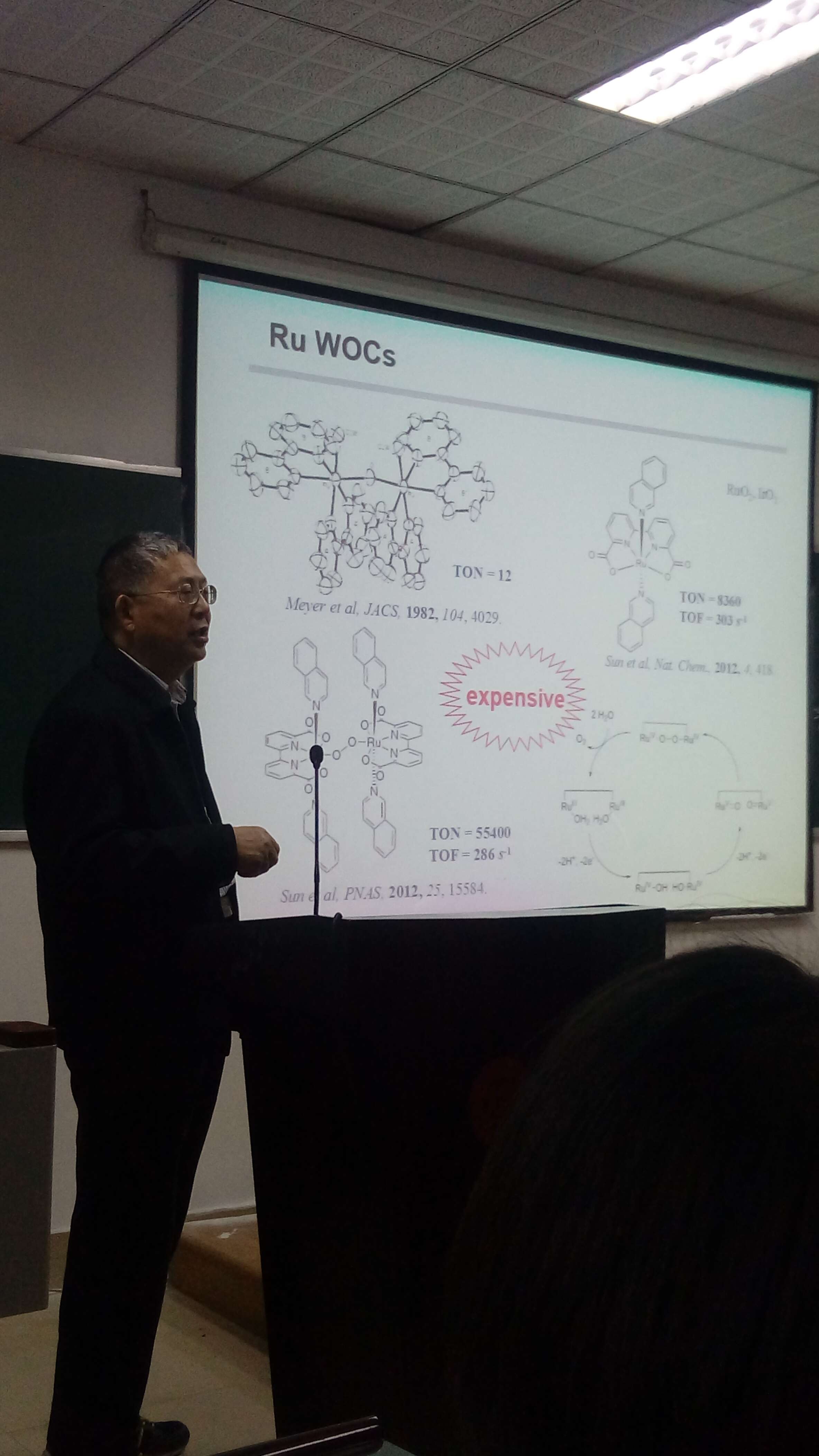 报告中,鲁统部教授首先结果生活实际介绍了研究水氧化催化剂的目的。其次,主要介绍了由一个稳定的MOF的光致水氧化的实验思路。报告结束,鲁统部教授对提出的问题一一进行了耐心的解答,赢得了热烈的掌声。