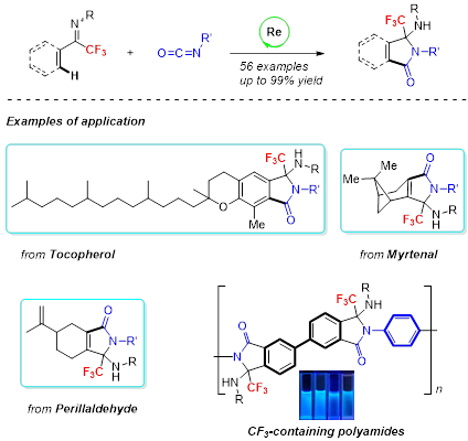 亚胺是合成胺类官能团的重要有机中间体。此外,在过渡金属催化的芳基及烯基邻位碳-氢键官能团化反应中,亚胺也是重要的导向基团,协助并参与了一系列的环化反应。然而,由于位阻效应及三氟甲基强拉电子作用引起的弱配位效应,三氟甲基酮亚胺参与的环化反应还未见报道,是一个挑战性的课题。张光武和熊恒英老师团队通过使用铼催化体系,实现了异氰酸酯与三氟甲基酮亚胺的[3+2]环化反应,高效构建了一系列新型的三氟甲基取代氨基异吲哚酮类化合物。该反应具有较广的底物适用范围及功能基团耐受性。此外,该方法还被成功应用于几类复杂分子的后期修饰中。最后,通过底物结构及反应条件的摸索,作者还实现了几类含氟聚合物的构建,并初步研究了聚合物的光学性能。