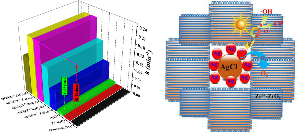 超宽禁带半导体因其特殊的电子结构和应用潜力在催化领域引起了广泛关注。本文基于结构设计与高效电荷分离的需要,采用溶剂热法-定向化学沉积的策略制备了系列高比面积、高结晶度纳米纤维组装的自掺杂Zr3+-ZrO2纳米团簇和自掺杂Zr3+-ZrO2包裹AgCl复合材料。这种AgCl@Zr3+-ZrO2纳米结构不仅有利于电荷分离、光的捕获与利用、传质和表面反应,同时也可利用Ag粒子的等离子体共振增强效应。实验结果表明,制备的AgCl@Zr3+-ZrO2复合材料具有较强的氧化能力和催化活性。此外,该工作也为超宽禁带半导体复合材料的结构设计与可见光催化应用提供了新思路。