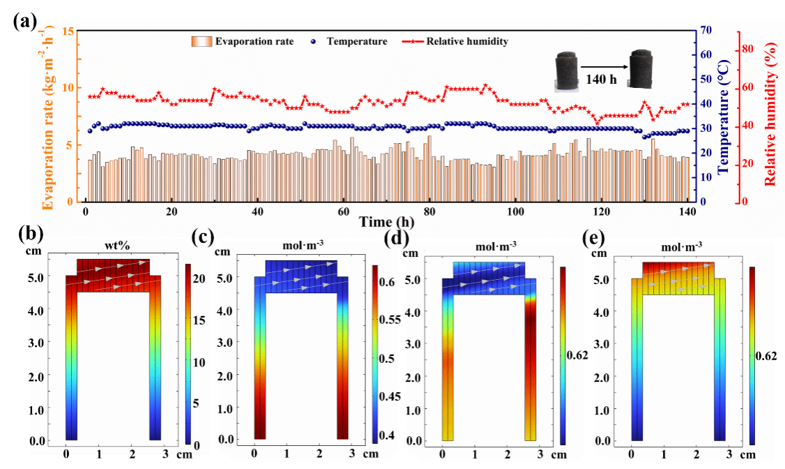 刘山虎教授课题组受天然大葱结构的启发,构建了一个基于硫化铜(CuS)和泡沫镍(NF)的三维分层卷曲圆柱形光热界面蒸发器,在1 kW·m−2的太阳辐射下实现了6.12 kg·m-2·h−1的蒸发速率。进一步研究表明,蒸发器的分层卷曲圆柱形结构减少了对下层水的热损失,优化了水输送和热管理之间的平衡。由于垂直和水平的水通道的协同作用,蒸发器在20 wt.%NaCl溶液中表现出优异的耐盐性和140小时的稳健脱盐性能。该工作为在极端条件下太阳能驱动海水蒸发器设计提供了理论和实验基础。