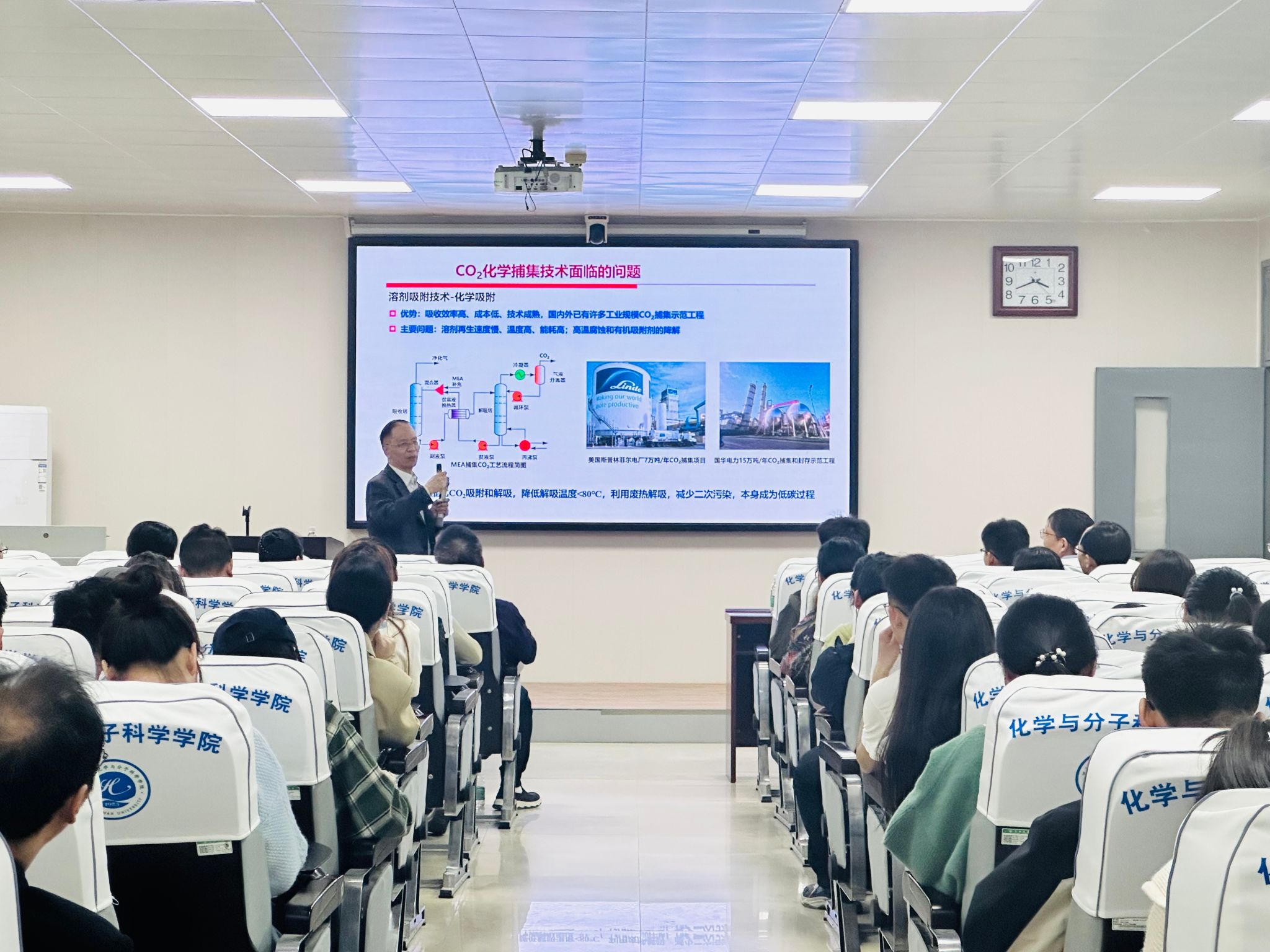 座谈会前,王键吉还在226会议室进行了一场题为“CO2捕集与转化中的构效关系”的学术报告。学院百余名师生参加,徐元清主持了报告会。