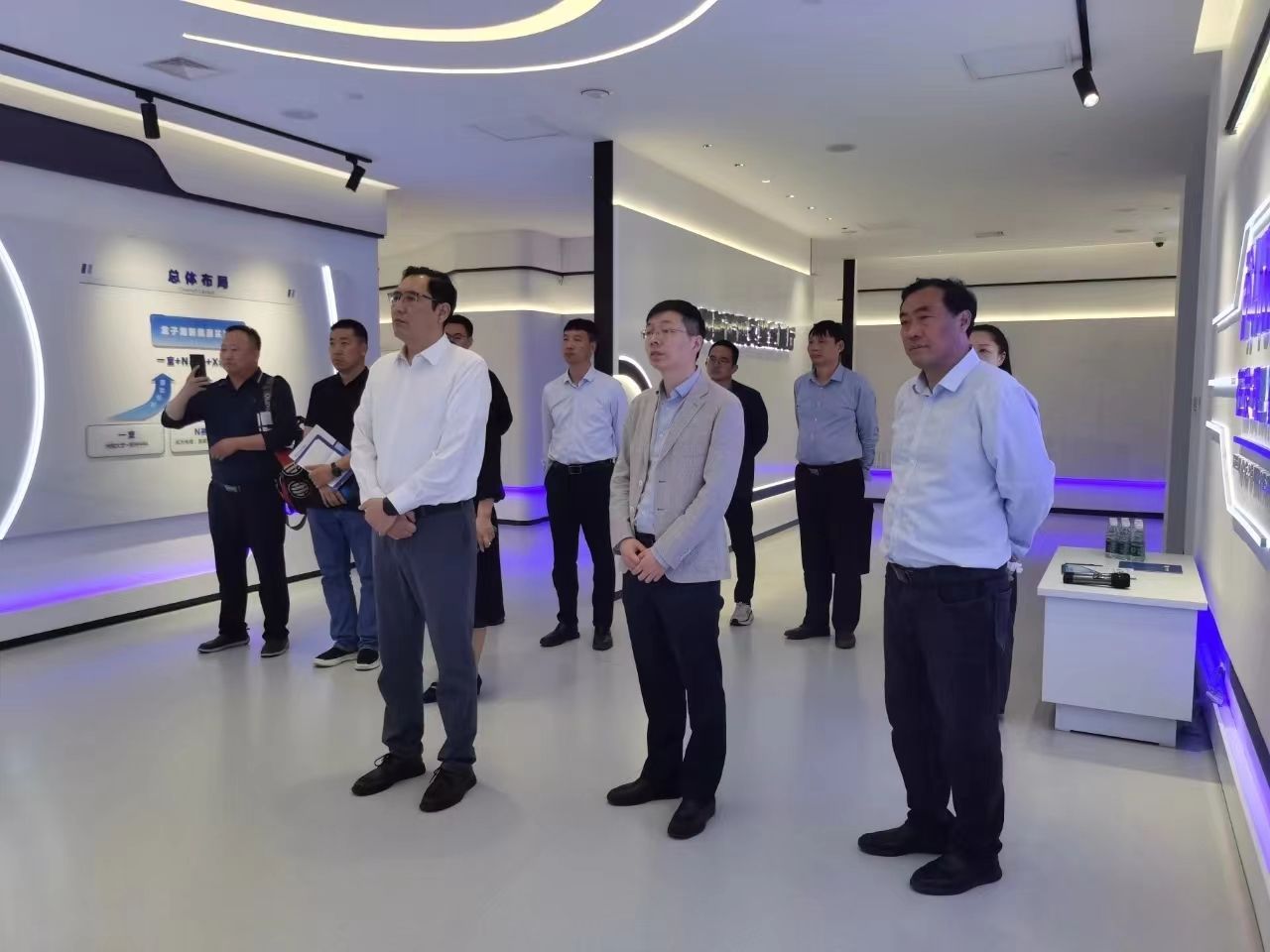 座谈会结束后,姚光磊一行在陈雪波的陪同下,参观了龙子湖新能源实验室展厅,并在楼前合影留念。