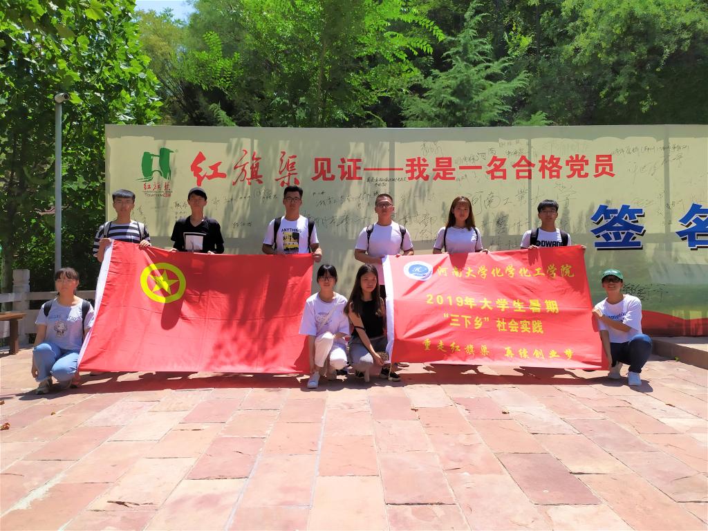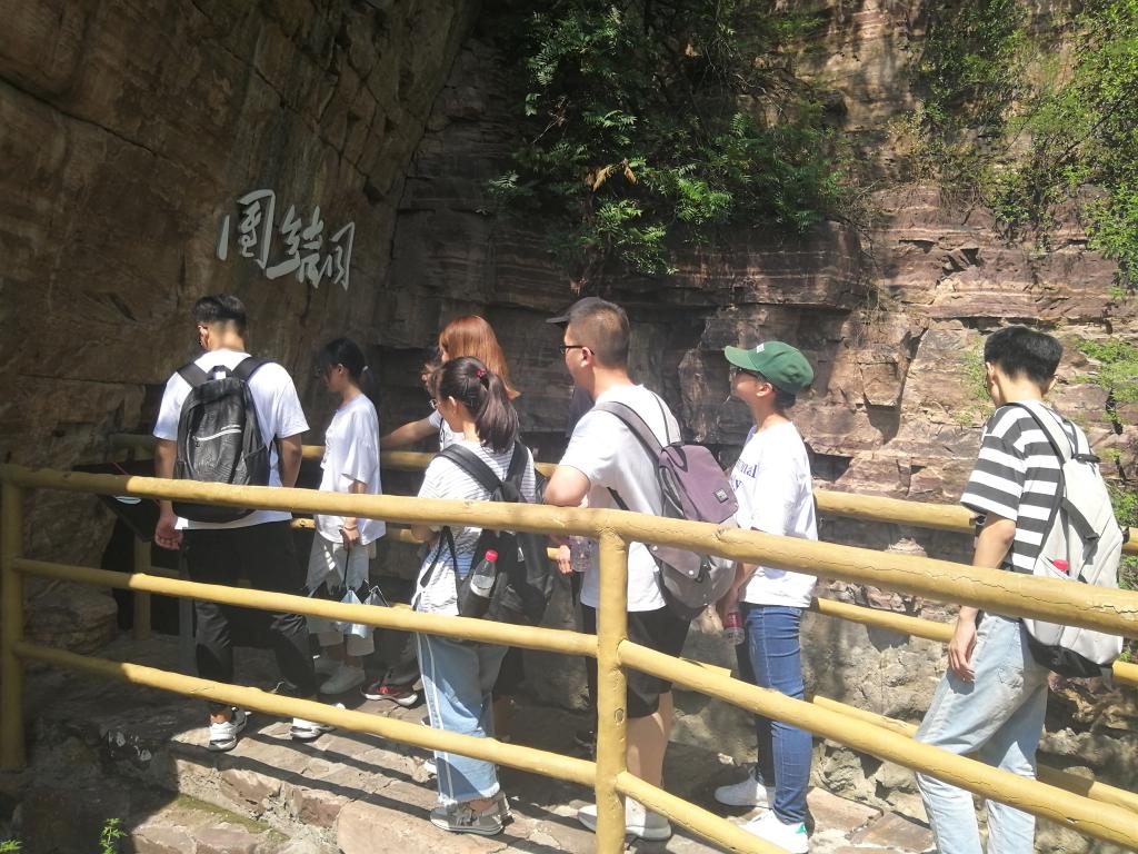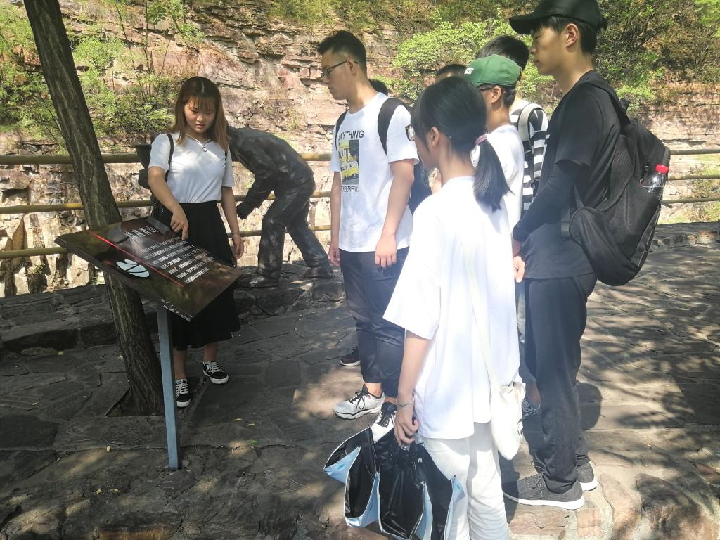 在红旗渠红色旅游景点,小分队成员沿着红旗渠干渠探寻时代的足迹,看着穿山而过的红旗渠水,队员们仿佛感受到了当年共产党员和青年人昂扬的革命斗志和战天斗地的英雄气概。沿途中,手推车、冲锋号等雕塑生动展示了修建红旗渠时的艰苦与不易。虎口崖、创业洞、团结洞等在悬崖峭壁上开凿出来的景点仿佛让大家看到了一幅幅人定胜天的历史画面。学习最后,小分队全体成员在红旗渠合影留念。