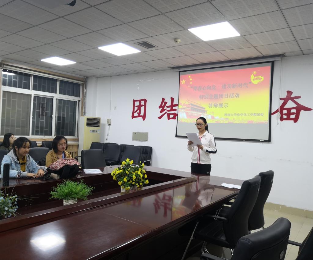 于4月21日晚上在学院220会议室举办了“青春心向党·建功新时代”特别主题团日答辩活动。化学化工学院团委副书记王钰、肖子威,团委学生会组织部部长明荣妤,16级、17级、18级年级团支书担任此次答辩会的评委。