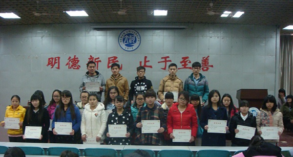 随后,马洁分别宣读了2014年暑假社会实践、秋季运动会、男排女篮获奖人员及学生会评优名单。王志乾、马洁为获奖人员颁奖并合影留念。