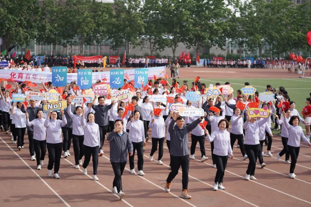 方阵以党委书记常凤香为领队,教职工们身着统一的服装,手中挥舞着红色国旗,举着“化育万物,学无止境”“争创世界一流”“Sports 加油”“秀出风格,赛出水平”等各类标语,精神抖擞。同学们身穿印有化学结构式的白色短袖,组成的方阵秩序井然,他们迈着整齐划一的步伐,举着醒目的旗帜——“化育百年,承启新篇,提质求新,争创一流”,体现了麻豆影视