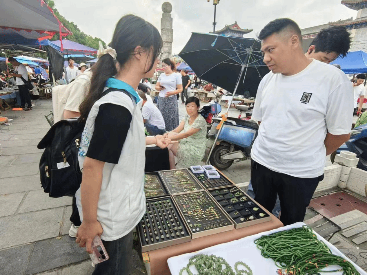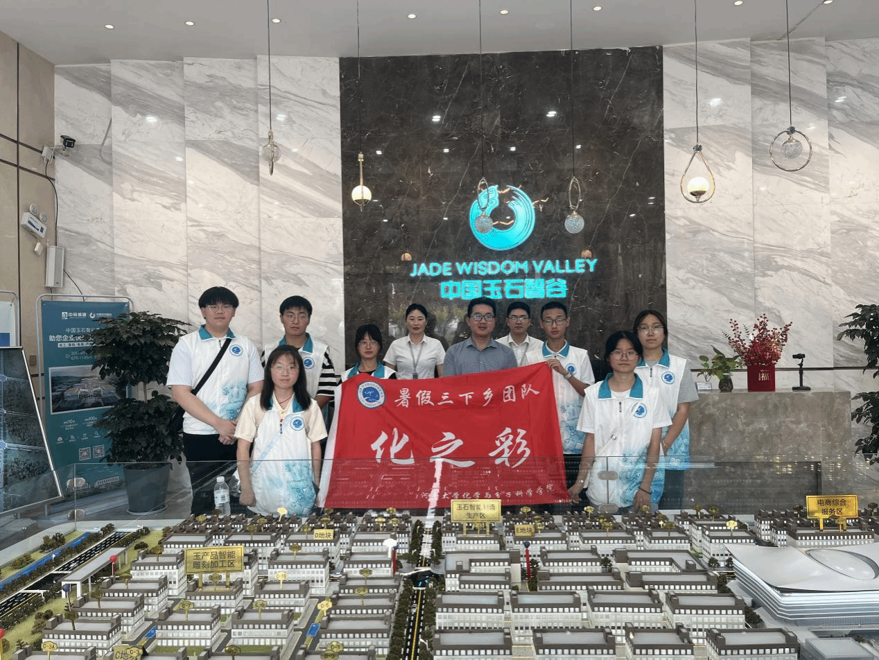 抛砖引玉、亭亭玉立、温润如玉、珠圆玉润、金玉良缘……在中国人的眼里,玉有太多美好的象征和寓意。团队成员一起走进了河南省南阳市镇平县玉城大道的中国玉石智谷园。首先,团队成员来到中国玉石智谷园的市场,这是一个集玉石加工、销售、文化交流于一体的综合性园区,旨在推动中国玉石产业的发展和文化传承。市场内琳琅满目的玉石制品让人目不暇接,从精美的玉器、玉佩到各式各样的饰品,无不展现出中国玉石的独特魅力。通过实地观察玉石的质地、颜色、光泽等特性,团队成员更直观地理解矿物学、晶体学以及材料科学等化学相关领域的知识。参观玉石市场为团队成员提供了一个将理论知识与实际应用相结合的机会,有助于他们更深入地理解和掌握化学知识。