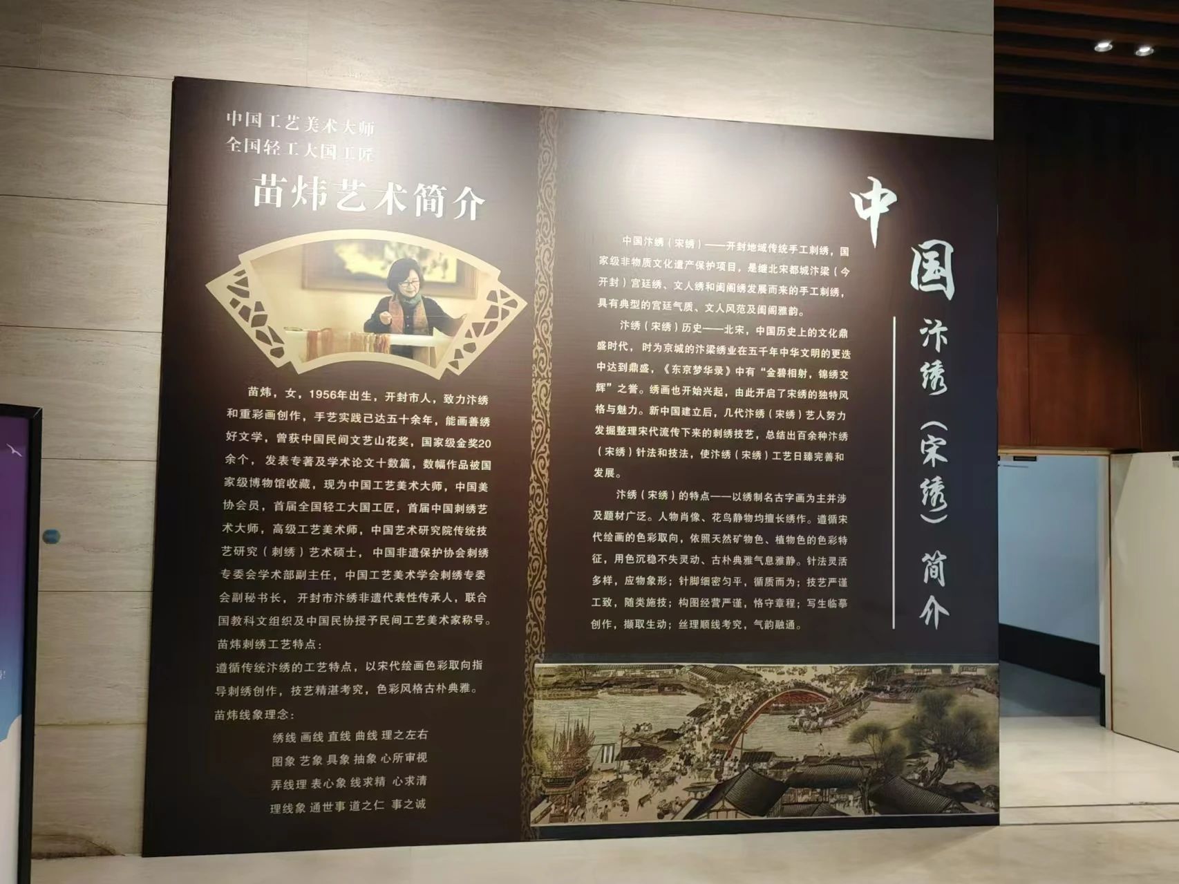 其次,团队来到开封汴绣研究所。在此团队成员进一步了解到汴绣的发展历史,并且参观了一楼大厅展出的精美绣品。