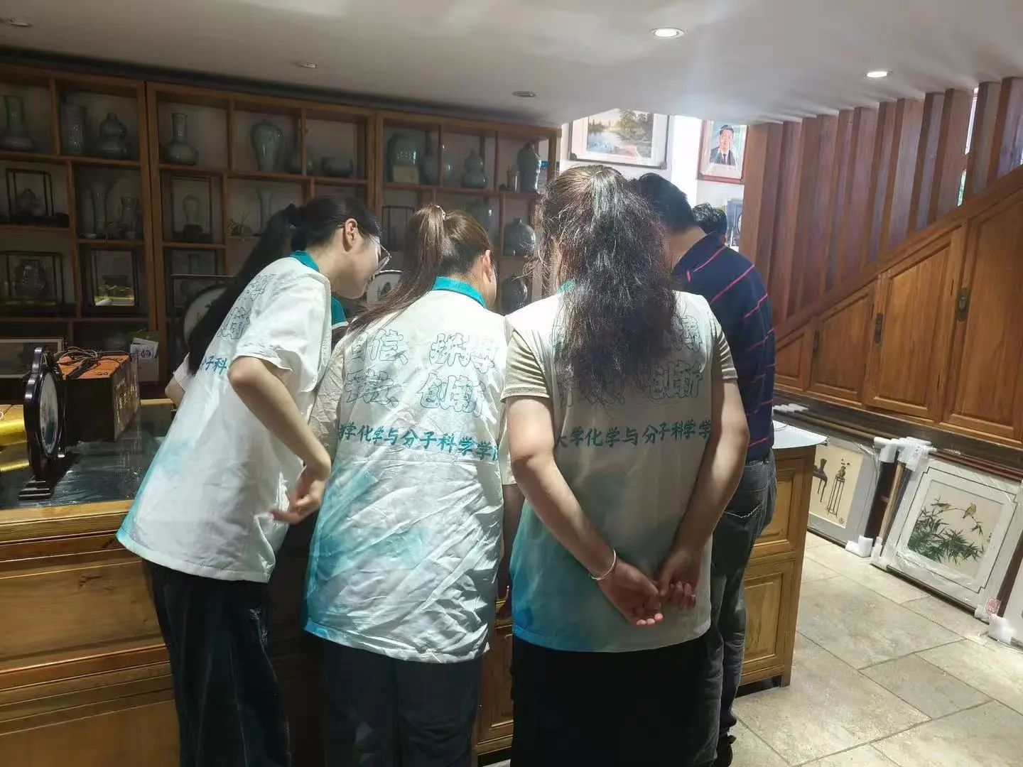 为了重焕汴绣的光芒,团队成员继续寻访之旅。团队成员们分别来到了无同轩和文兰轩两个艺术馆。在这里,成员们感受到汴绣艺术的多样性和创新性。这些作品不仅展现了传统汴绣的精湛技艺,还融入赋予汴绣新的生命力的现代元素。同时通过与艺术馆老板的交谈,成员也了解到汴绣行业发展路线单一,销路窄,缺乏创新性。针对这些问题,当地文化部门积极开展相关活动推动汴绣的传承与创新。团队成员们也认为创新出更多符合现代文明审美的产品会推动汴绣的发展。