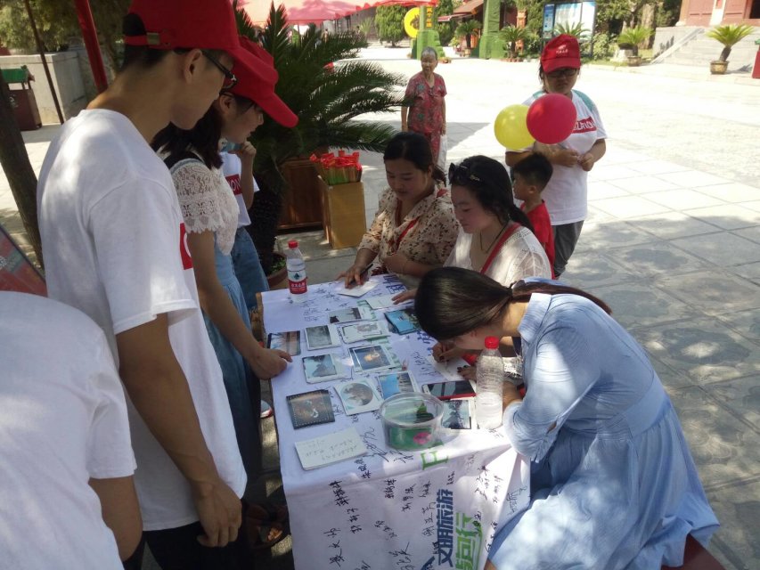 一次采访,解读游者心声,一次引导,促进文明一步。进入景区们,志愿者们按照原计划先采访来往游客,了解游客对文明旅游的看法。采访中志愿者们得知,很多游客对近年来频繁出现的肆意践踏风景,丢垃圾、画标识等表示失望,不仅影响了旅游的心情更是对国民的素质表示担忧。虽有心制止但很多情况下却是有心无力的,他们表示一个人的力量是有限的,希望有更多的人加入到文明旅游的行列中,还景区一片净土。当得知Chevilization团队此行的目的后,游客们对此高度赞扬,并与志愿者们一起高呼:“文明背包客,为开封加分”!