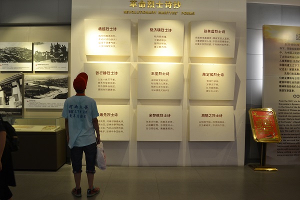 在英烈事迹展示厅中,展示了鄂豫皖苏区各名烈士的光辉业绩。为国争光、为国捐躯、英勇牺牲的烈士用生命谱写着英雄赞歌,石壁上那一首首英勇悲壮的诗章震撼着志愿者们的心灵。