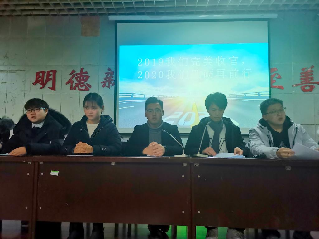 此次会议由团委副书记王金鑫主持。会议伊始,学生会主席王宇轩做学生会工作总结,从三下乡成果展示到秋季运动会,再到“礼赞新中国”系列活动,团委学生会举办了大大小小二十项活动,他用精炼的两个字“完美”表达了对大家的工作的认可,并为辛勤付出的学生会成员们表示感谢。展望2020年,他分别以结交“两个朋友”、培养“两种功夫”、具备“两种力量”等方面勉励在场同学,希望大家不断努力,共同谱写团委学生会未来的绚丽华章。
