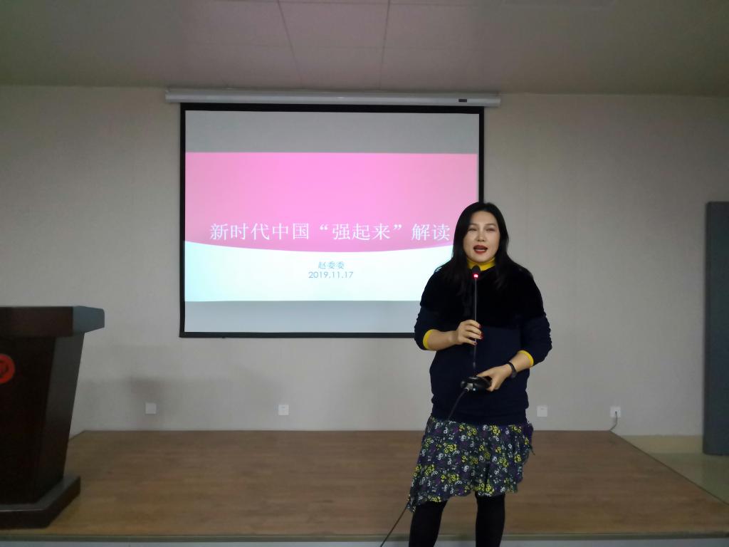 赵委委以“新时代中国‘强起来’的解读”为主题进行授课。她联系当代国情,结合实际生活,用幽默风趣的语言从新时代、新矛盾、新目标三方面解读了中国现今形式,通过强调“强起来”的重要性、解释会“强起来”的原因,增强学生的使命感与责任感。并以马克思主义相关理论为理论依据,以中国现今形式为现实依据提出了获取民心、建立国际话语权等实现中国强起来的伟大梦想的重要举措。此外,她还鼓励同学们利用课余生活大量阅读政治、社会学等方面的书籍,以增长见识、锻炼思维、拓宽视野。在赵委委老师通俗易懂的讲解之后,学员们更深刻地认识了新中国的主要发展历程,更深入了解到了我国国情。