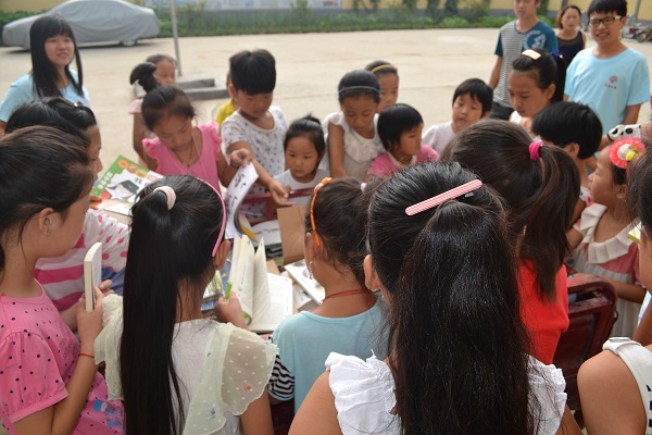 8月7日一大早,身着统一淡蓝色T恤衫的志愿者们温柔地唤醒了酣睡的村庄,他们正小心翼翼地将辛苦筹集来的三百五十八本图书运往志愿支教小学--田庄小学,为当地留守儿童建立“爱心书屋”,成为一道靓丽的风景线,装点了这个质朴无华的村庄。