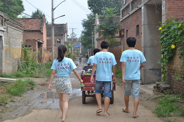 化学化工学院“筑梦—帮扶”暑期社会实践团队的志愿者们正在安阳滑县老店镇田庄村为此美丽愿望献出一份力。