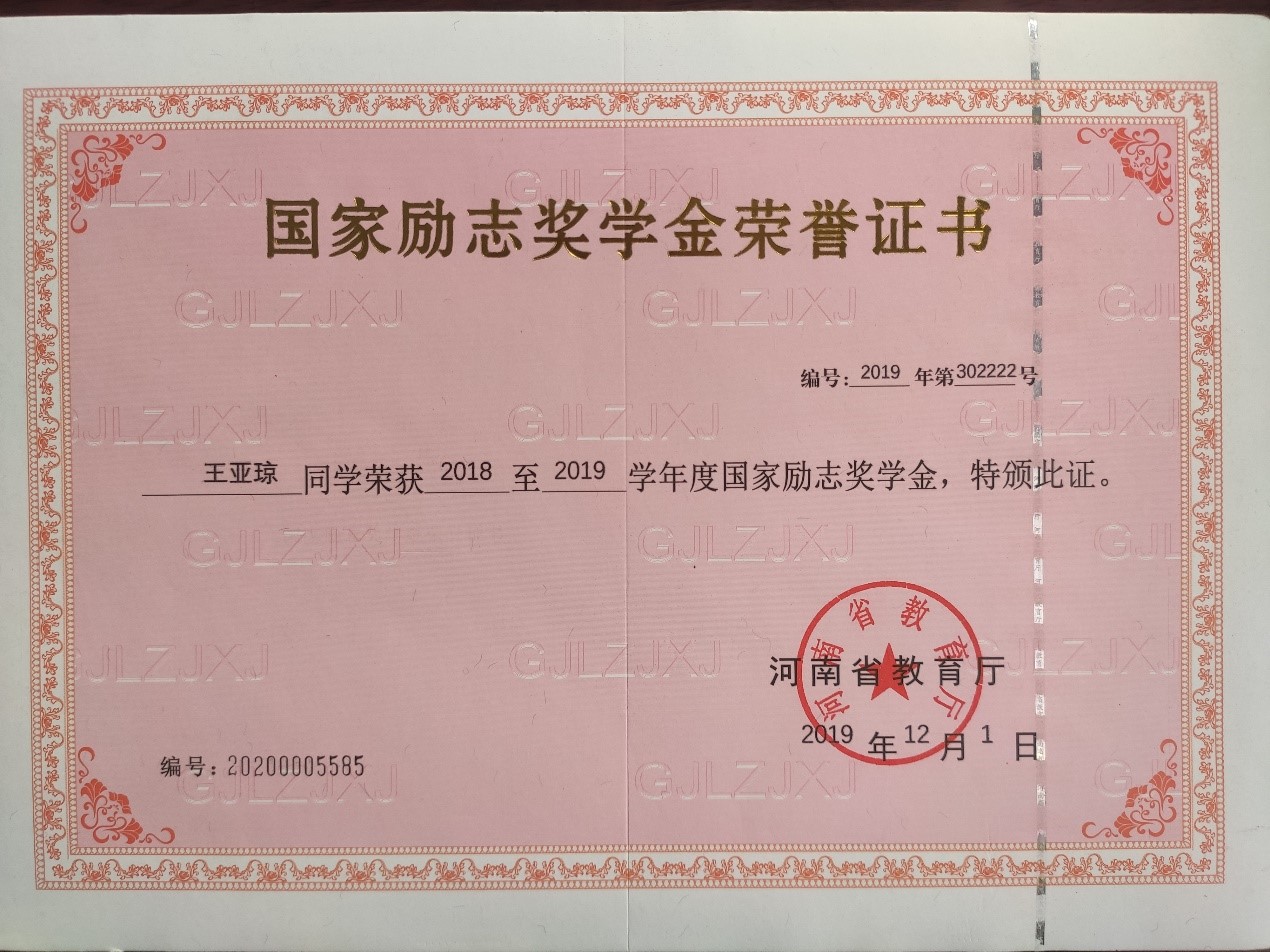 王亚琼同学对自己的寄语:未来成长的道路,也许会人烟稀少、也许会孤独难行,但我要相信,我的诚信和自强会给我一双“翅膀”,国家资助会给我勇气,让我在青春中续飞翔,勇闯属于自己的星辰大海。