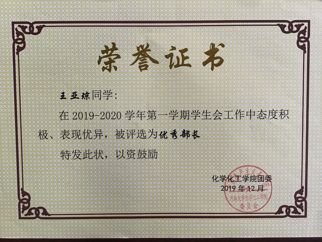 第七届“助学•筑梦•铸人”主题宣传活动图片作品优秀奖,积极参加全国大学生化工设计大赛和化工原理实验大赛,在前五个学期的成绩排名中位列专业第一,综合排名名列前茅。