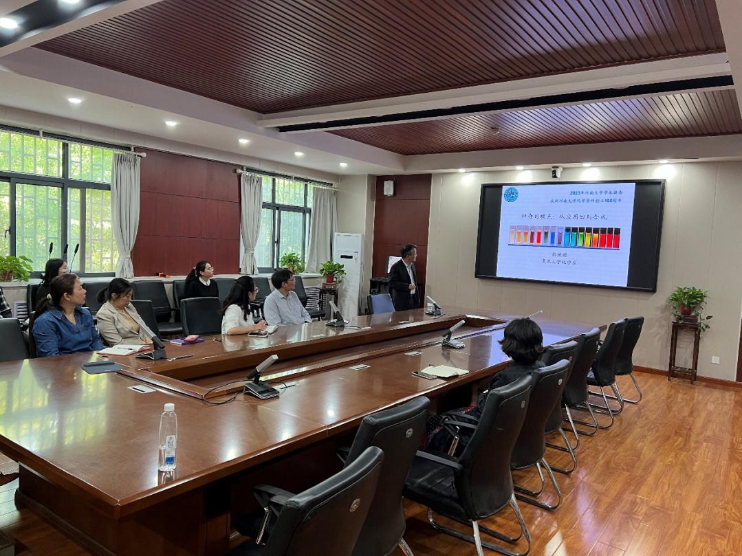报告会上,熊焕明教授首先回顾了碳点材料的发展历程,介绍了碳点的性质、分类;随后,对碳点的合成思路进行了汇总和概述,指出了现有液相合成碳点路径的局限性,并提出了对新一代固相法合成碳点线路的理解;最后,根据碳点特性展望了它在发光器件、生物成像、电化学储能以及电化学催化剂中的应用价值。报告内容丰富且有深度,开阔了与会师生在碳点制备与应用方向的视野。报告结束后,熊焕明教授与参会师生进行了深入而热烈的讨论。