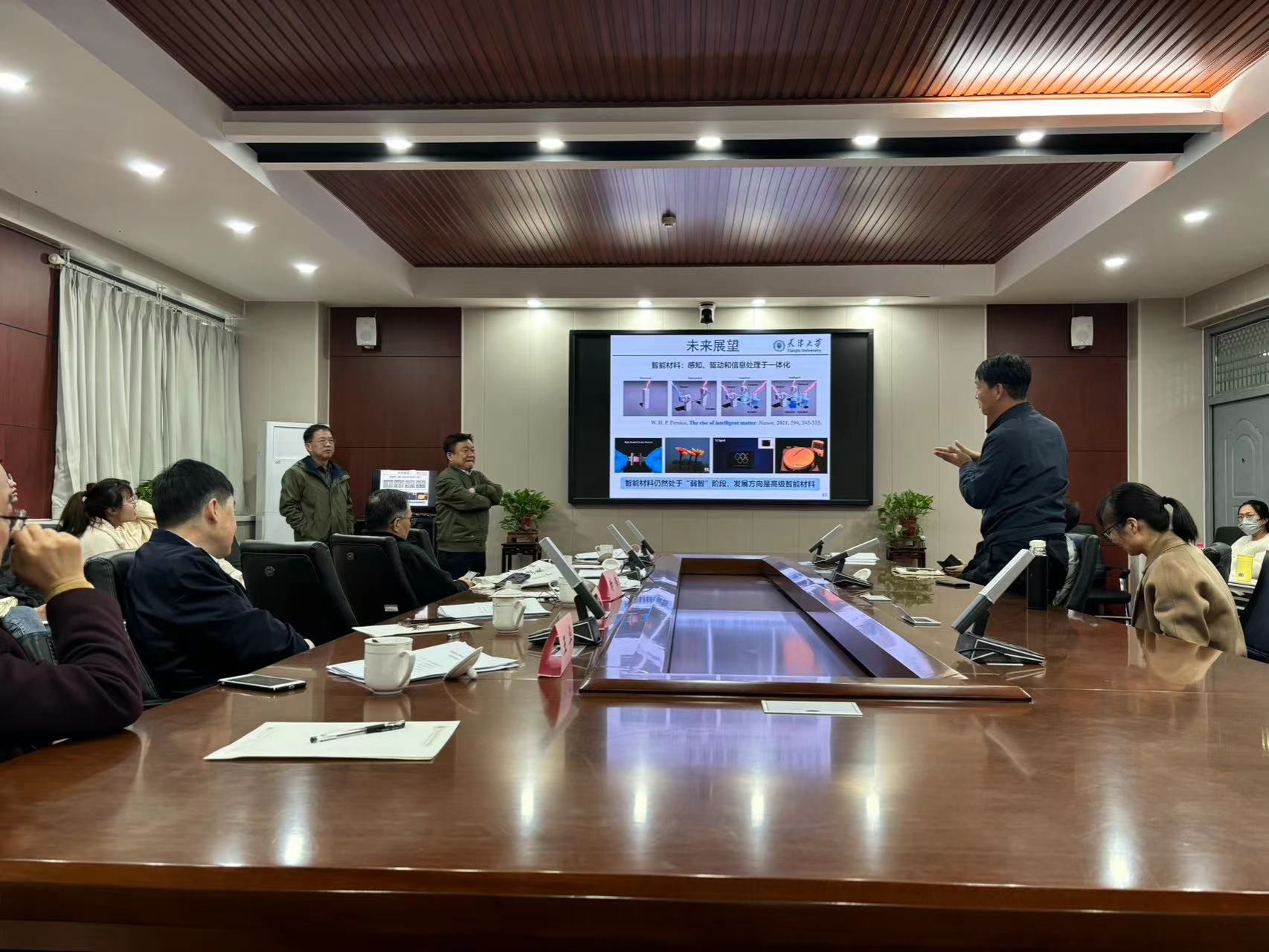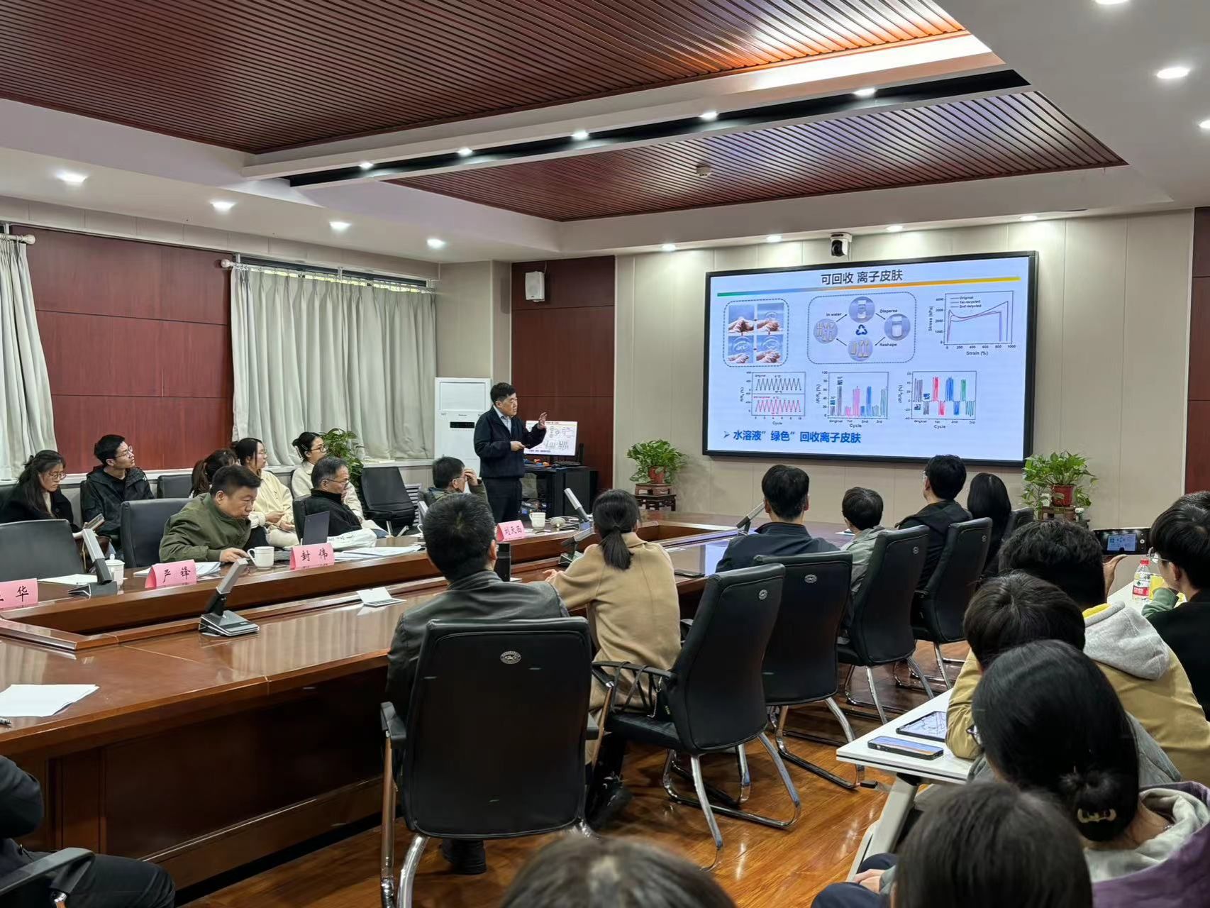 报告中,严锋教授讲解了(聚)离子液体凝胶的分子设计与合成方法及其在可穿戴器件、能源器件等领域的应用。聚离子液体是指由离子液体单体聚合生成的,在重复单元上具有阴、阳离子基团的一类离子聚合物,兼具离子液体和高分子聚合物的优良性能。由于聚离子液体同时具备离子液体与聚合物的优点,并且克服了离子液体的流动性,因而近年来得到大家的关注。封伟教授介绍了“热”相关功能材料的设计与合成方法及其在可能量管控与智能器件等领域的应用。他概述了团队近年来在“热”相关的材料科学研究进展,包括偶氮基材料光热转换与存储材料、碳基与聚合物基弹性导热材料、热控变构变功能的智能材料研究。报告结束后,两位教授与参会师生进行了深入交流,并全面回答了大家提出的问题。