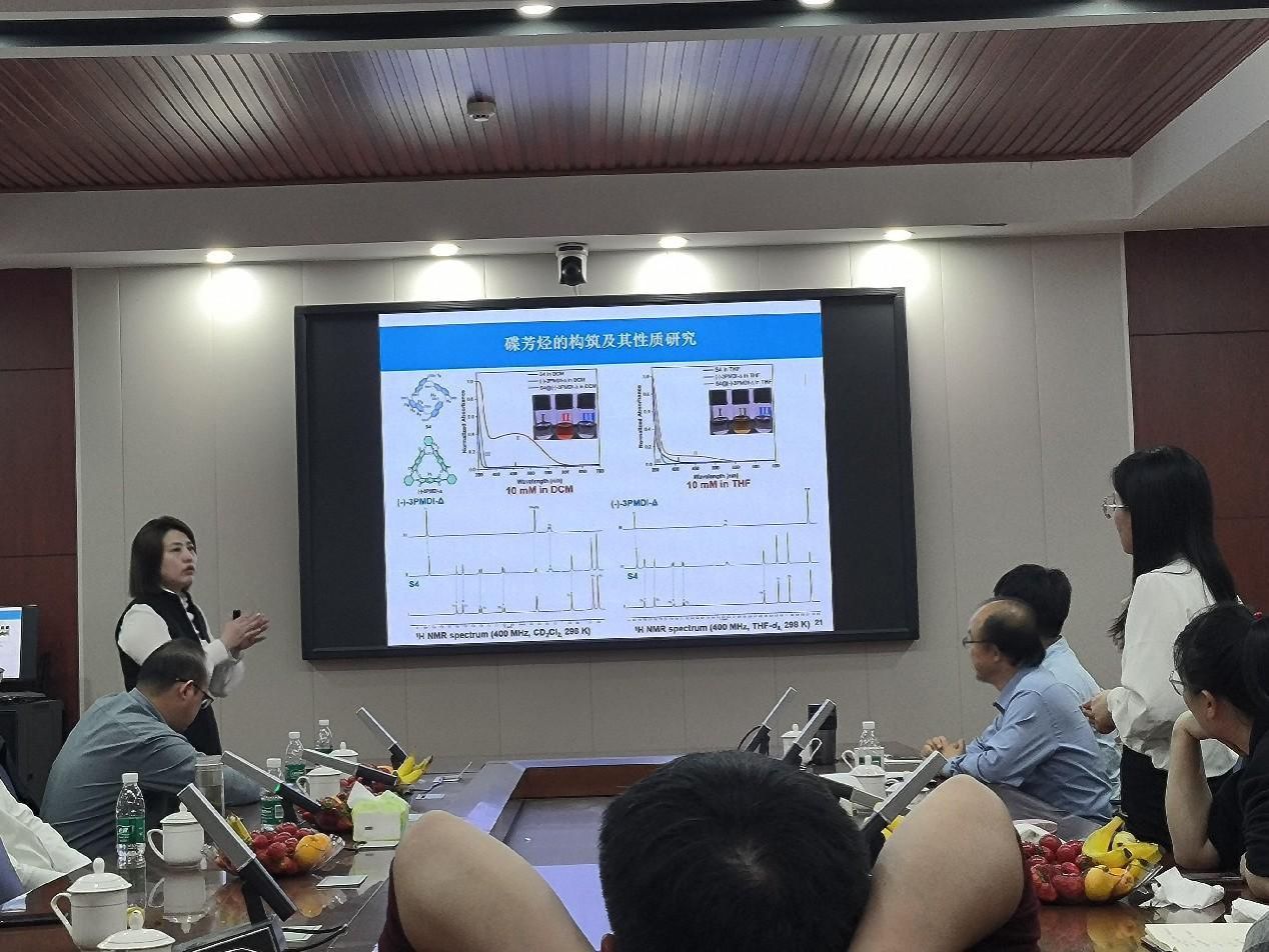 在报告中,韩莹详细介绍了其课题组在新型大环芳烃的开发上的最新进展。课题组采用创新的“一锅法”成功合成了一种名为碟芳烃的新型大环芳烃。这种碟芳烃不仅具有电子丰富的深腔结构和强烈的荧光性质,而且能够与多种客体形成稳定的络合物。碟[4]芳烃与手性大环受体结合后,能形成电荷转移共晶。这些共晶展现出由手性诱导的变色性质,能够特异性地检测不同链长的烷基酮化合物。此外,通过环到环转化策略,他们团队以碟芳烃为原料合成了萘[4]芳烃衍生物。这些衍生物与TCNB在不同浓度和温度条件下共组装,选择性地形成了依赖于构象的晶态发光共组装体,从而实现了对大环芳烃构象依赖的发光颜色的调控。报告结束后,她与参会师生进行了深入交流,并全面回答了大家提出的问题。