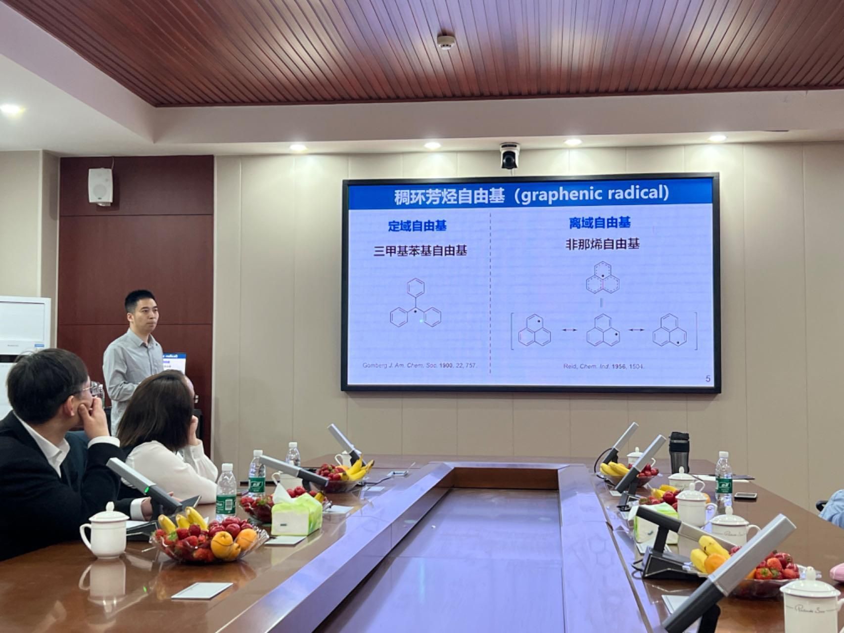 报告中,孙哲介绍了其课题组近年来在具有开壳电子结构的有机共轭自由基体系,以及具有环状分子结构的碳纳米环体系的合成、性质和应用研究进展。他的报告主要从三个方面展开:1)稳定的奥林匹克自由基及二聚体的高效合成;2)开发了自旋分布导向的POP策略和共轭扩展的自由基一维链,实现良好的自由基导电性质;3)设计合成了系列径向共轭扩展的碳纳米管结构。报告结束后,他与参会师生进行了深入交流,并全面回答了大家提出的问题。