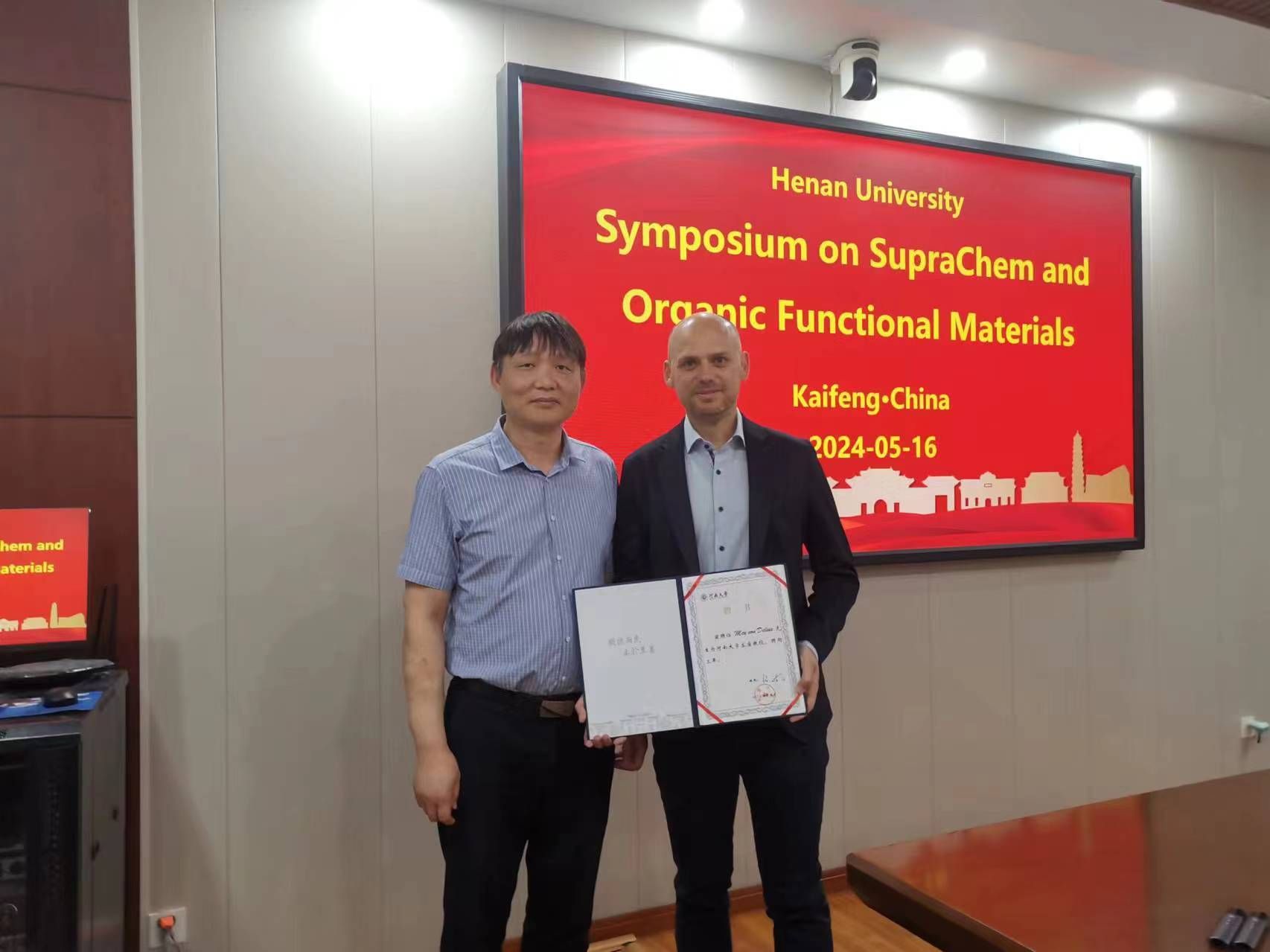 5月16日,超分子化学与有机功能材料学术研讨会(Symposium on SupraChem and Organic Functional Materials)在学院220举行。德国乌尔大学Max von Delius教授、北京师范大学江华教授、中山大学朱克龙教授、西湖大学刘志常教授、中国科学技术大学的杜平武教授应邀出席,学院30余名教师和学生参加。执行院长徐元清教授主持了开幕式,并向Max von Delius颁发了客座教授聘书。