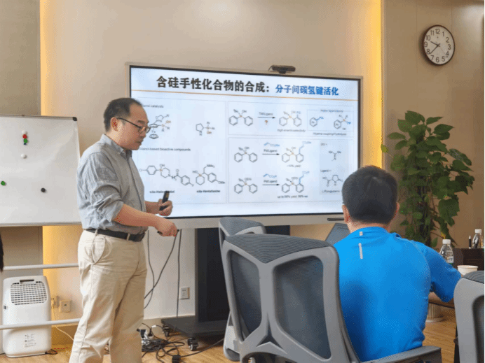 报告中,王鹏介绍了其课题组近年来在硅中心手性功能分子的不对称催化构建和含硅手性配体在金属催化领域中的最新研究进展。他围绕手性硅化合物的不对称催化构建富详述了一系列含硅功能分子的合成方法、含硅手性配体的结构特点等,详细说明了硅手性分子构建的难点及挑战以及含硅手性配体在不对称催化反应中的优势,重点阐述了硅的引入对母体手性配体结构手性诱导的影响。报告结束后,他与参会师生进行了深入交流,并全面回答了大家提出的问题。