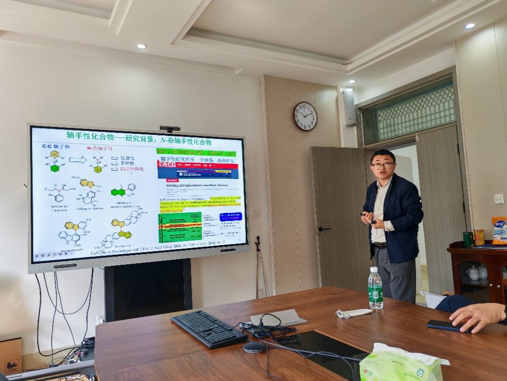 报告中,刘人荣介绍了其课题组利用去对称化及不对称偶联策略,实现了一系列高效构建C-N及N-N轴氮杂手性化合物的新方法,为轴手性化学发展提供了新的思路。轴手性化合物广泛存在于天然产物、医药、农药、染料及光电材料分子中,是众多手性催化剂及配体的核心骨架。过去几十年,化学家们发展了一系列构建C-C键联芳基轴手性化合物的策略。在轴手性化合物的旋转轴中引入含氮杂原子从而形成N-杂轴手性化合物,大大增加了轴手性化合物的种类及复杂程度,其原因主要是与C-C轴手性相比,N-杂轴具有较高的旋转自由度和较低的构象稳定性,从而导致该类化合物的不对称合成具有很大的挑战。报告结束后,他与参会师生进行了深入交流,并全面回答了大家提出的问题。