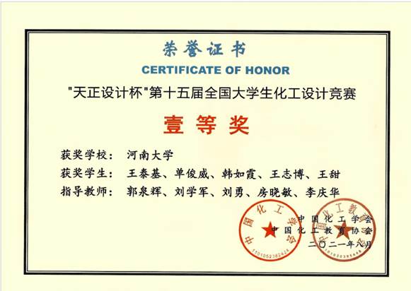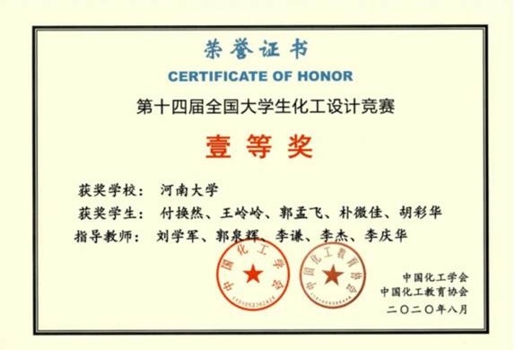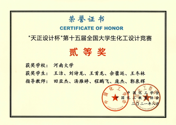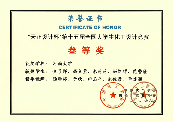 指导本科生获国家级全国大学生化工设计竞赛奖
