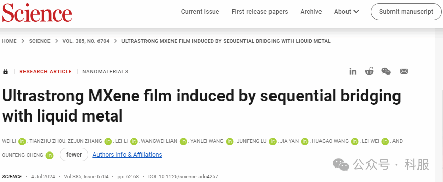 2024年7月4日,北京航空航天大学化学学院程群峰教授团队在Science期刊发表题为“Ultrastrong MXene film induced by sequential bridging with liquid metal”的研究论文(并被选为当期Science封面),北京航空航天大学Li Wei(李威)、Zhang Zejun(张泽军)、Li Lei(李雷)与新加坡南洋理工大学周天柱(原北航博后)为论文共同第一作者,程群峰教授为论文通讯作者。