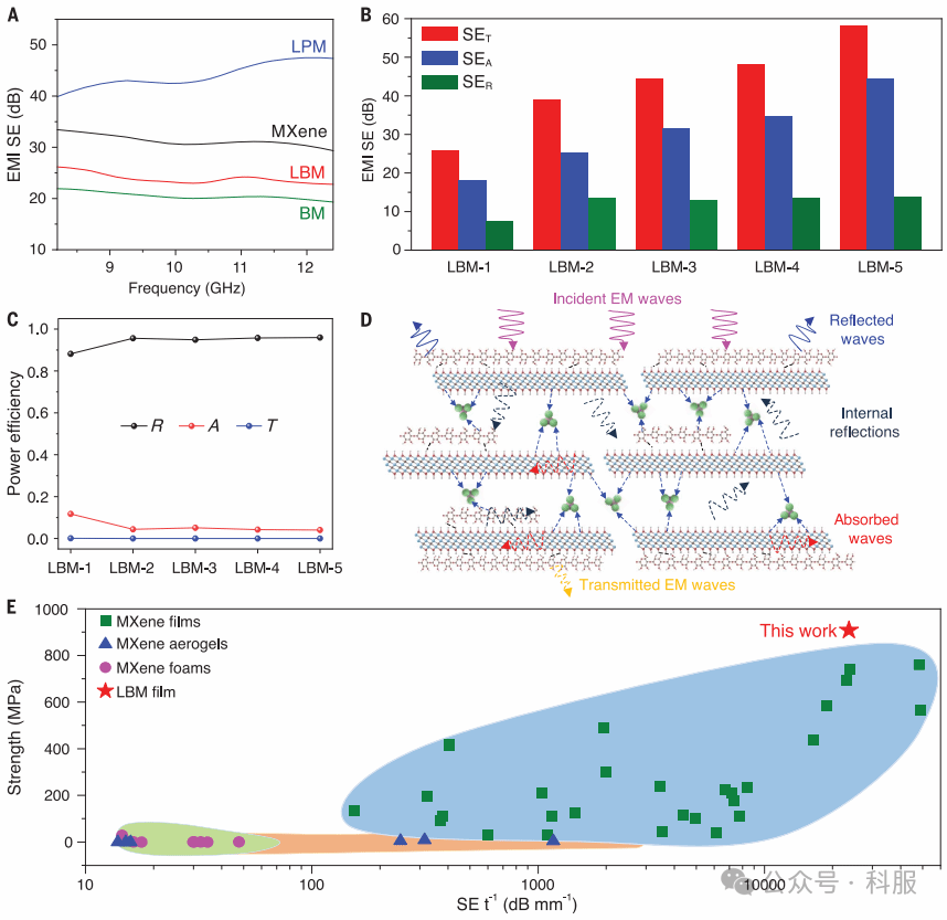 总之,该研究利用LM和BC依次桥接MXene纳米片,制备出了一种超强宏观LBM薄膜。LM纳米颗粒有效减少了LBM膜的空隙,BC的氢键和LM的配位键极大增强了MXene纳米片之间的界面相互作用。这些研究结果进一步提高了MXene纳米片在LBM薄膜中的应力传递效率。此外,LBM薄膜具有较高的电磁屏蔽效率。该研究提出的使用LM和BC的制造策略减少了空隙,提高了应力传递效率,从而可以将其他二维纳米片组装成高性能材料。