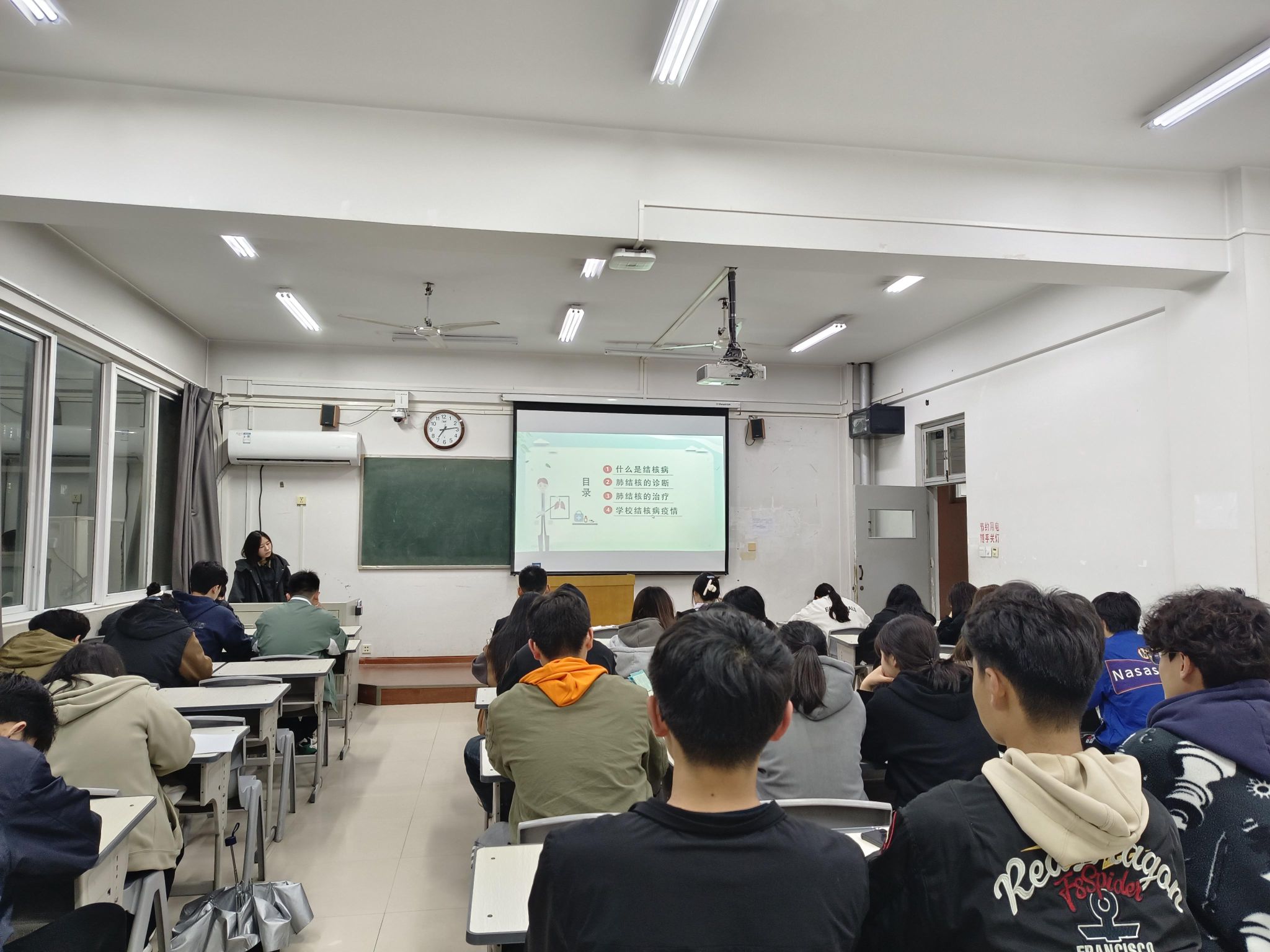 组织召开关于预防结核病主题班会。在本次班会上,结核病防治学生志愿者宣传员向同学们传达了学校召开的结核病防治安康知识讲座的有关内容,讲述结核病历史,讲解了如何预防结核病,结核病的发病病症和特征,以及什么类型的结核病有传染性,并且嘱咐同学们一旦发现自己有一周以上的咳痰、咳血、盗汗等病症发生时要及时就医,并及时向班干报告,争取做到早发现早治疗。同时希望大家不要有恐慌心理,不能歧视结核病人,更不能在未经证实的情况下传播谣言。