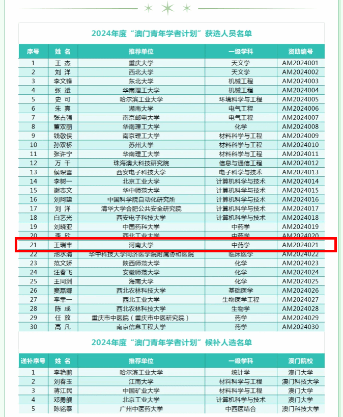 我校博士后王瑞丰入选2024年度“澳门青年学者计划”